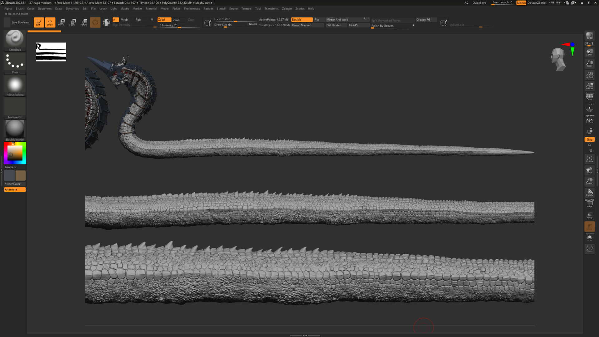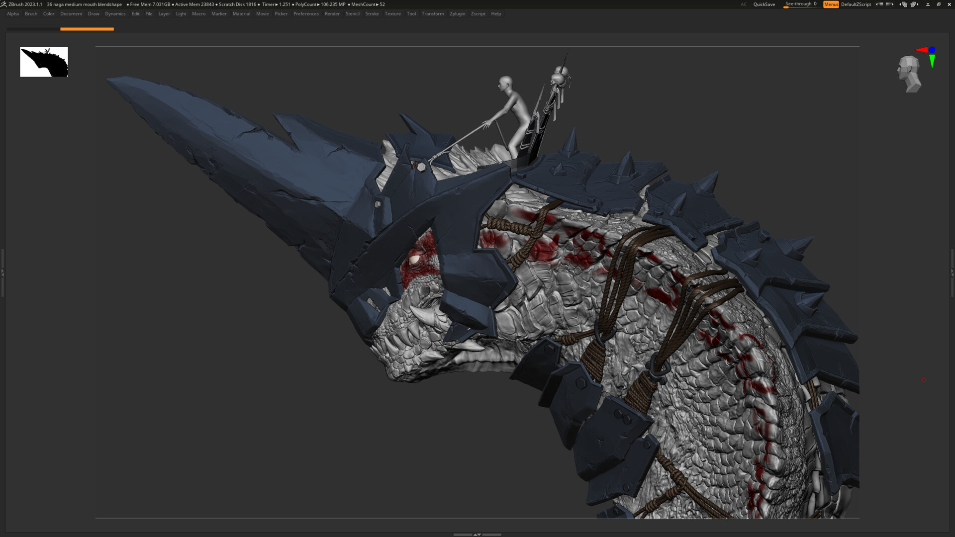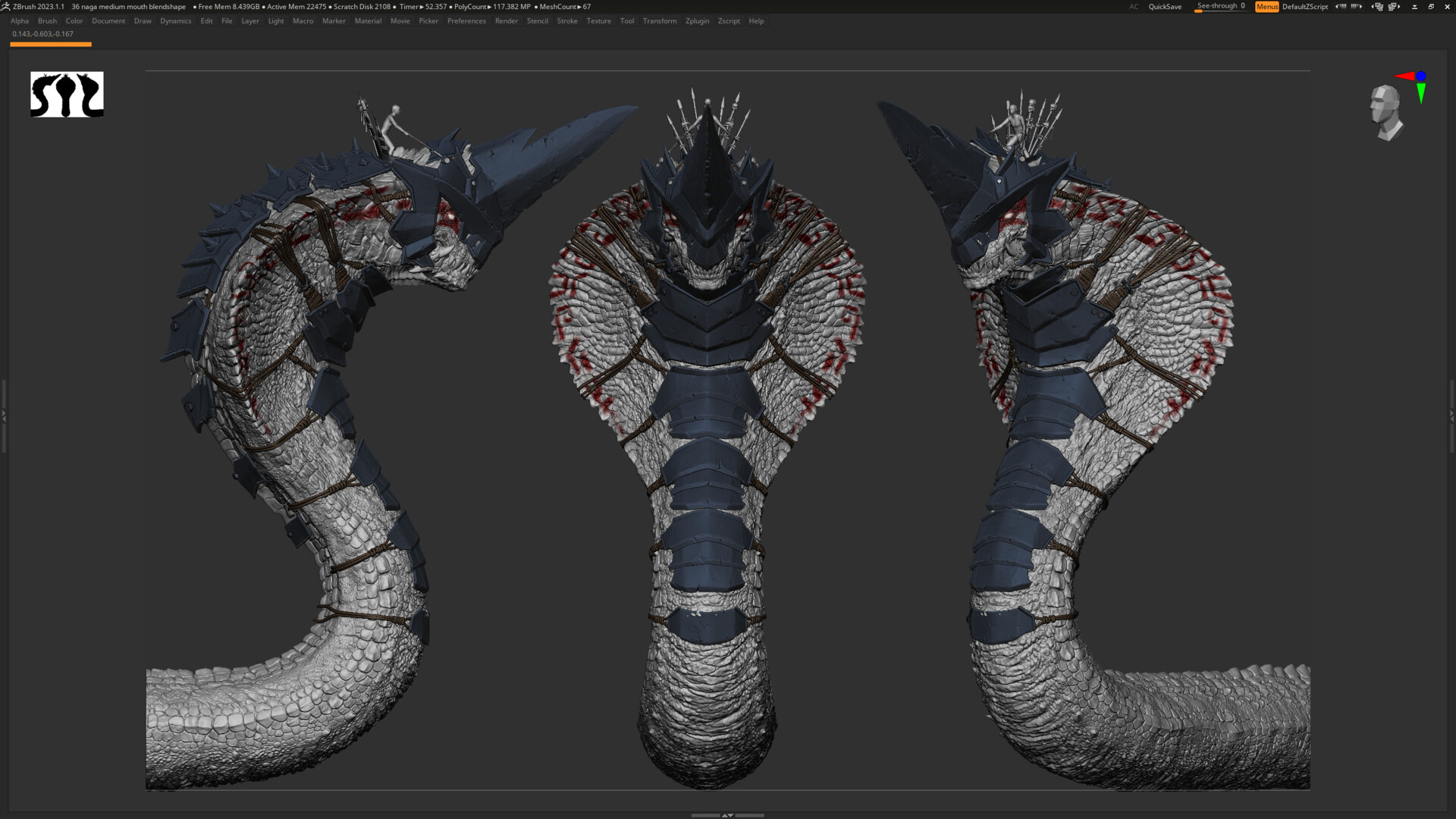 The sculpt was created entirely in ZBrush, focusing on anatomical flow and armor-like scaling inspired by traditional Burmese temple carvings.