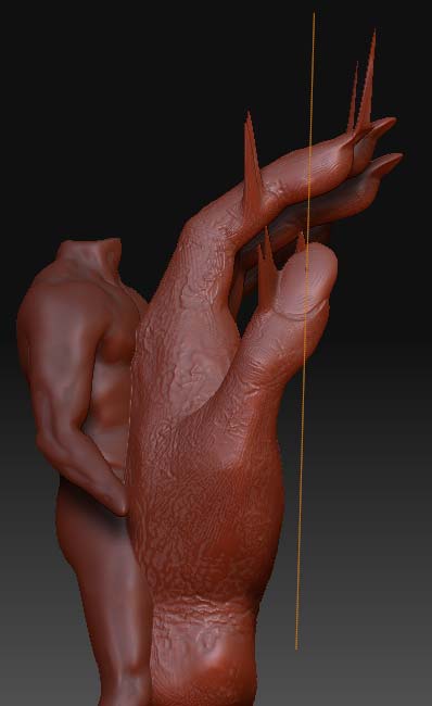 There has to be some better way, though. First off, the transpose tool has got to be the most awkward tool I have ever used and scaling a hand down to the size of the body takes a crazy amount of time. I think it might be okish for fine details, but for simply moving and scaling in a way that keeps the proportions it seems utterly useless and there’s just no reason for it to be so frustrating. Worse, the hand is getting all wonky and has these weird spikes all over. This happens whether I scale it at the highest or lowest geometry settings (not that this should matter).
