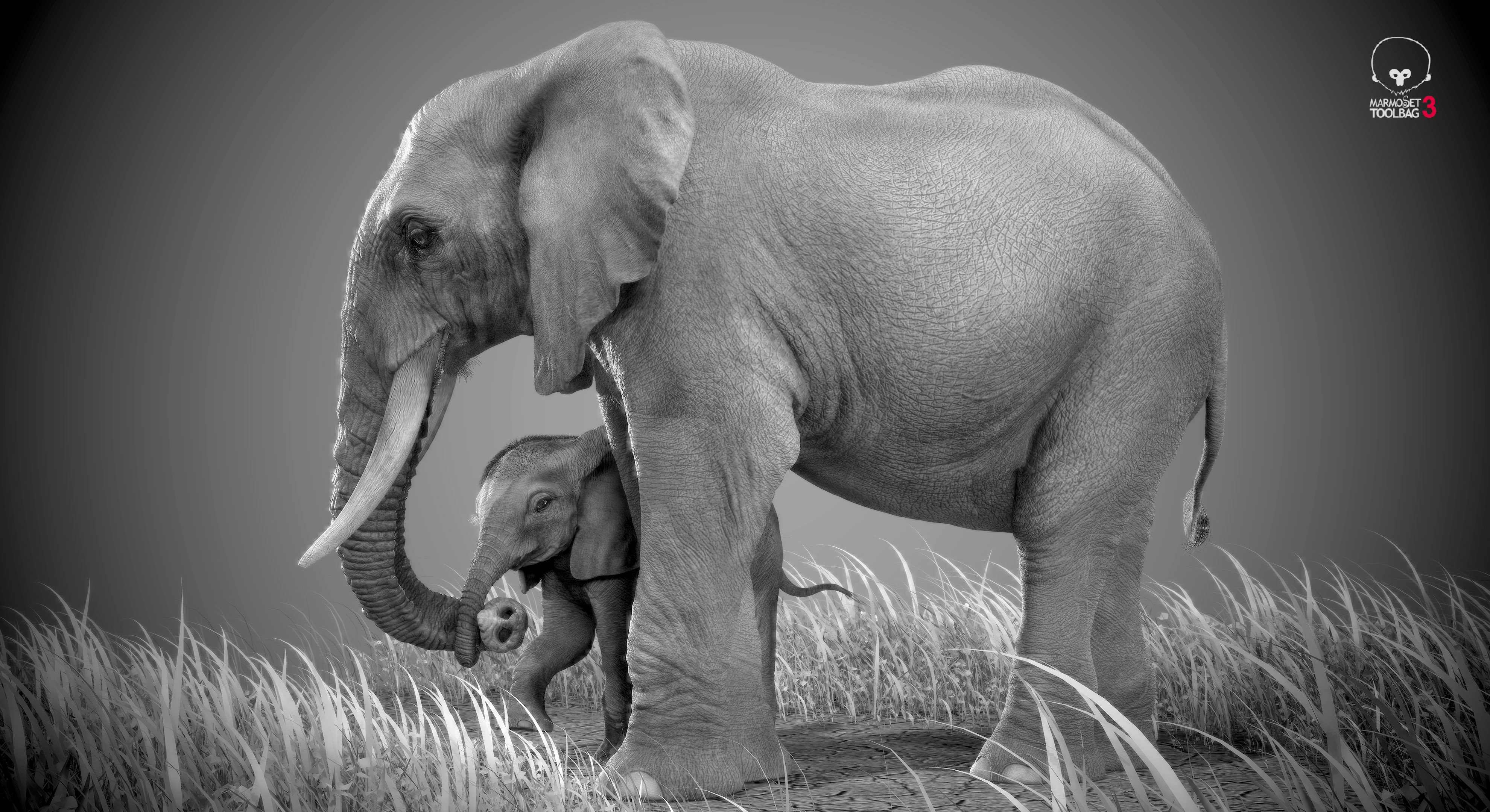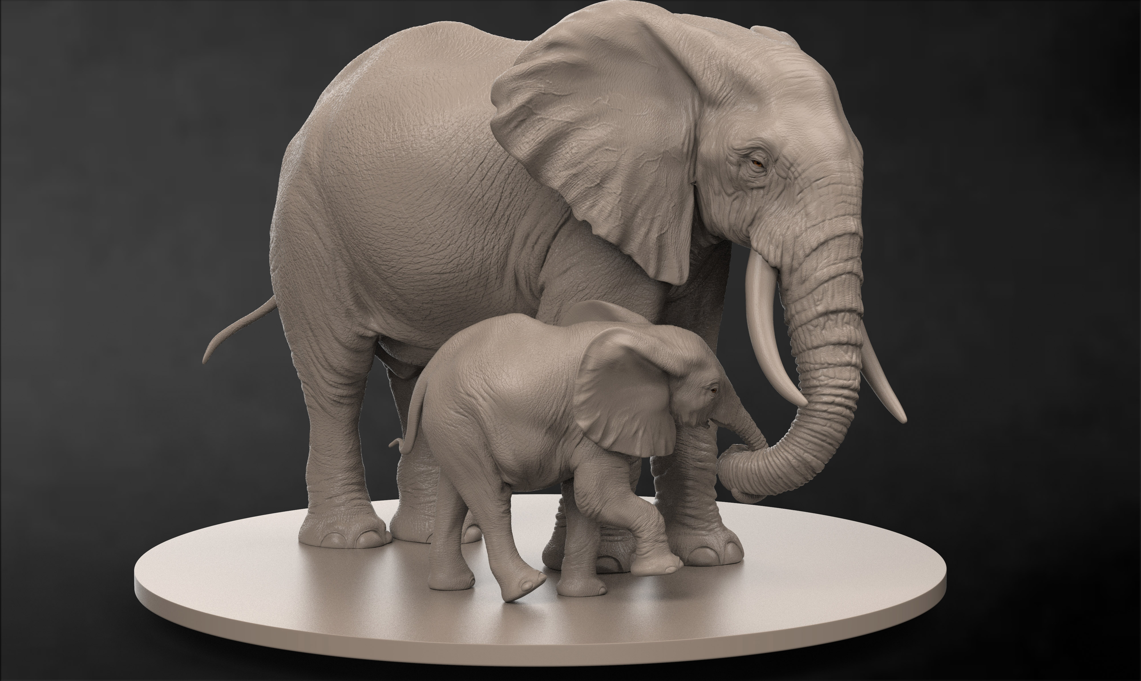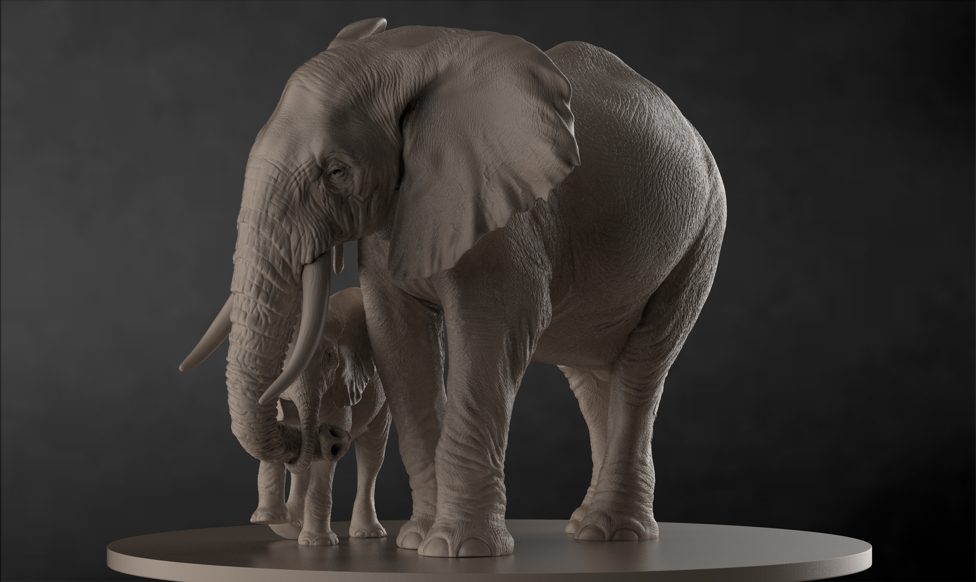 Hi artist friends, This is my first post in zbrushcentral. Here I tried to achieve the feel of affection.Elephants shows their affection , love & playfulness like humans.Anyone who has seen an Elephant with its calf can instantly recognize their love and protective affection for their babies, that inspired me to choose elephants for my title (Affection). All sculpt and basic texturing done with zbrush,secondary maps done with photoshop & substance painter and rendered using marmoset toolbag.