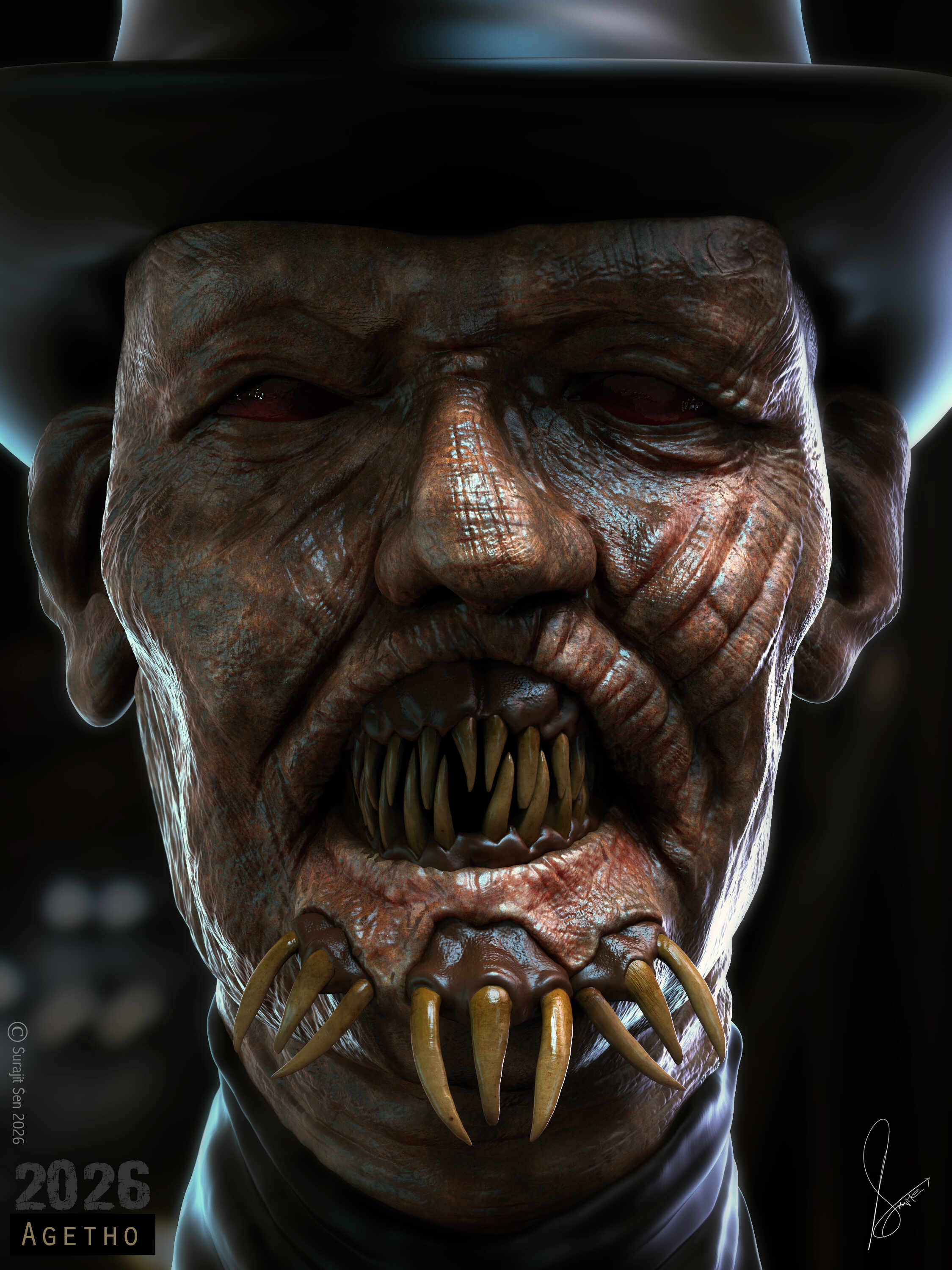 Agetho is my exploration of fear shaped into flesh and bone, a face carved by time and darkness. Through this sculpture, I wanted to capture the raw, unsettling presence of something ancient and unknown.Every wrinkle, scar, and tooth tells us of decay, survival, and hidden aggression. The character stands between human and monster, blurring the boundary of reality and nightmare.