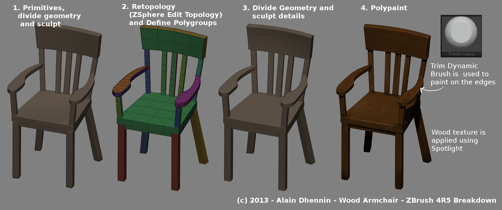 The Polygroups sets on step 2 are very usefull to apply the wood texture. I set the Auto Masking to ‘Mask by polygroup’ to the standard brush and used it with Spotlight. By setting this option it’s more easy to paint only on a particular side of your mesh.