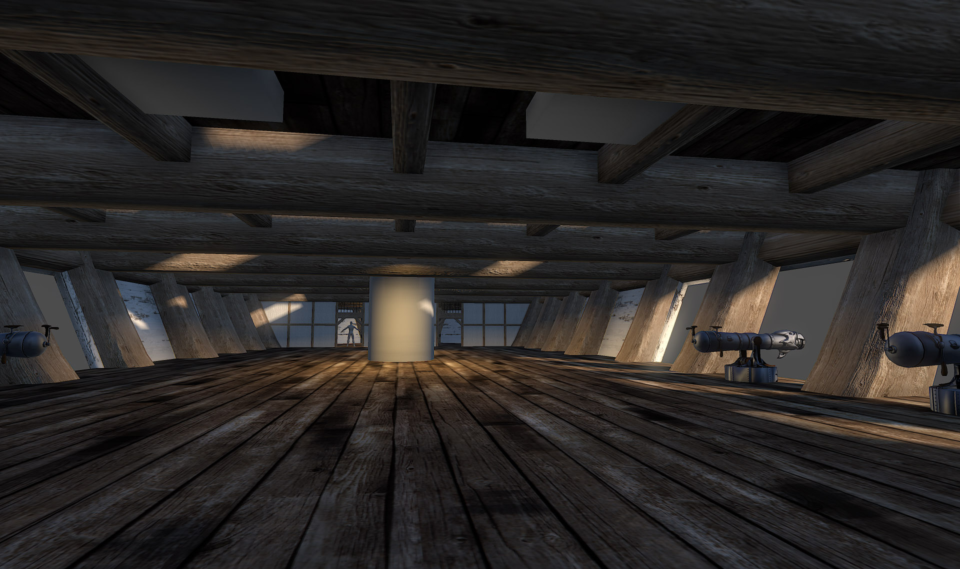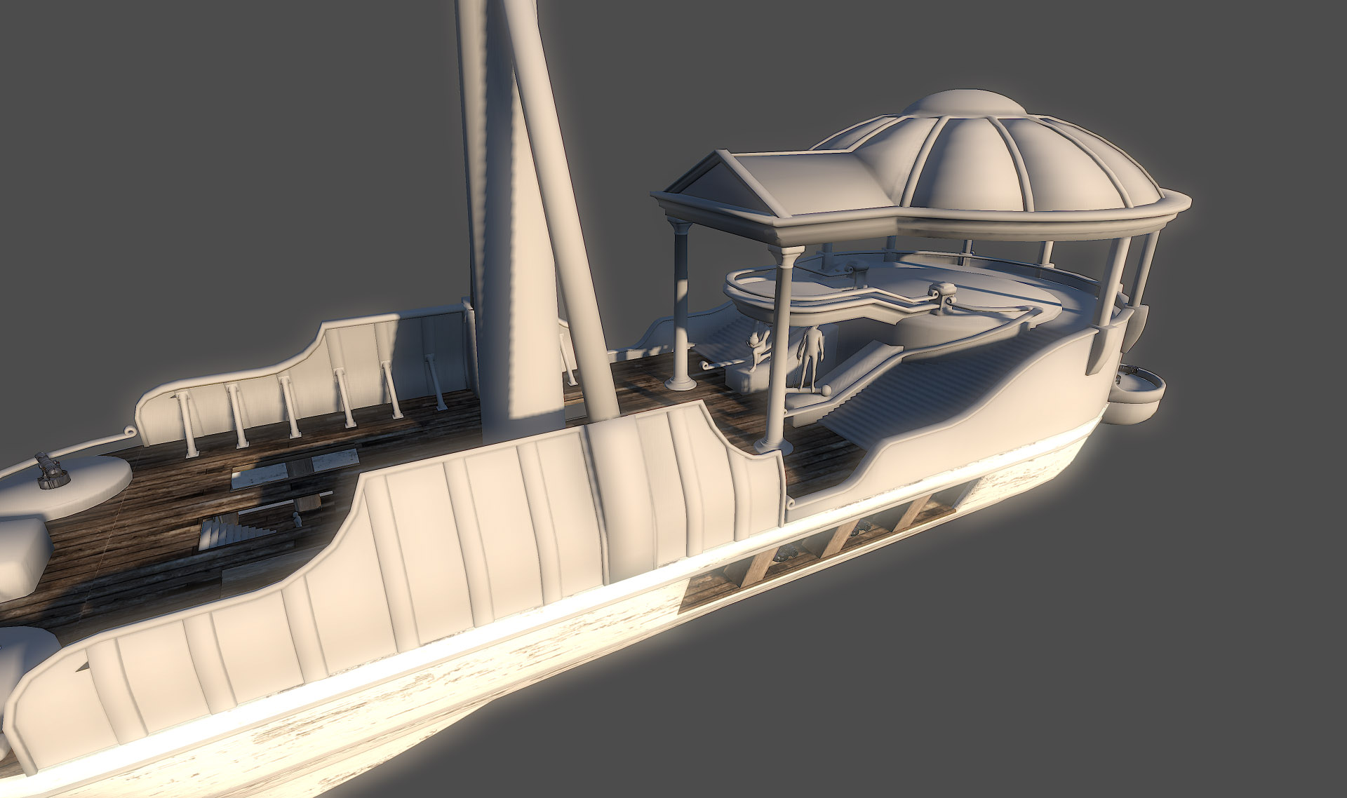 WIP stills from where I ended up before the weekend. Got the lower deck partially squared away, at least blocked in as far as where things will go – still have a lot to do down there. The upper deck is awaiting textures and details, but the ship is mostly ready for the alpha.