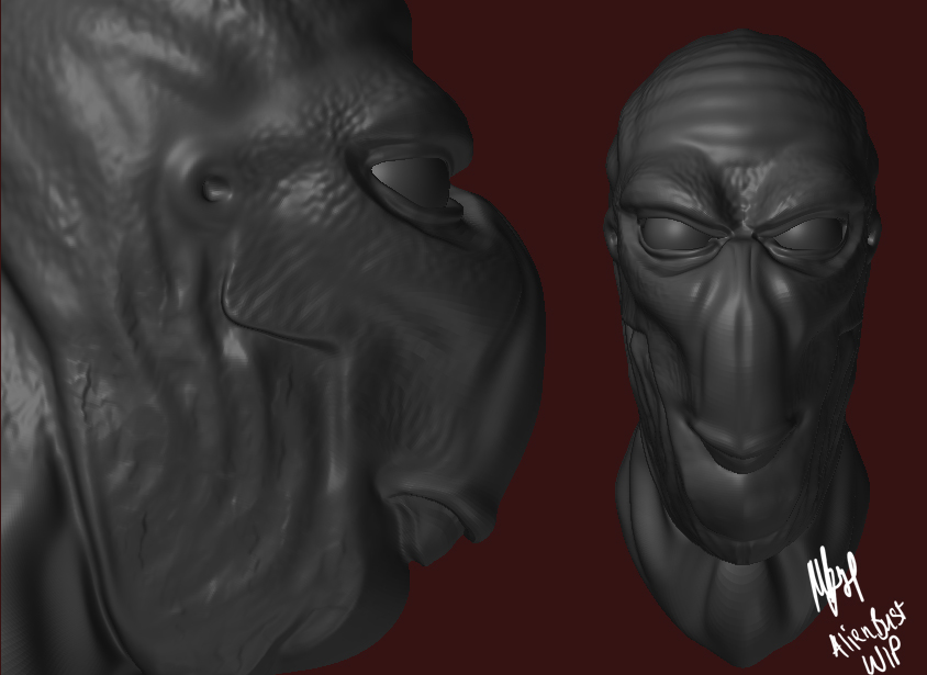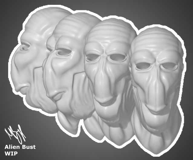 A change of pace…an alien bust, which I am rather happy with so far. I just can’t seem to get the eye-shape right yet. Any thoughts…greatly appreciated.