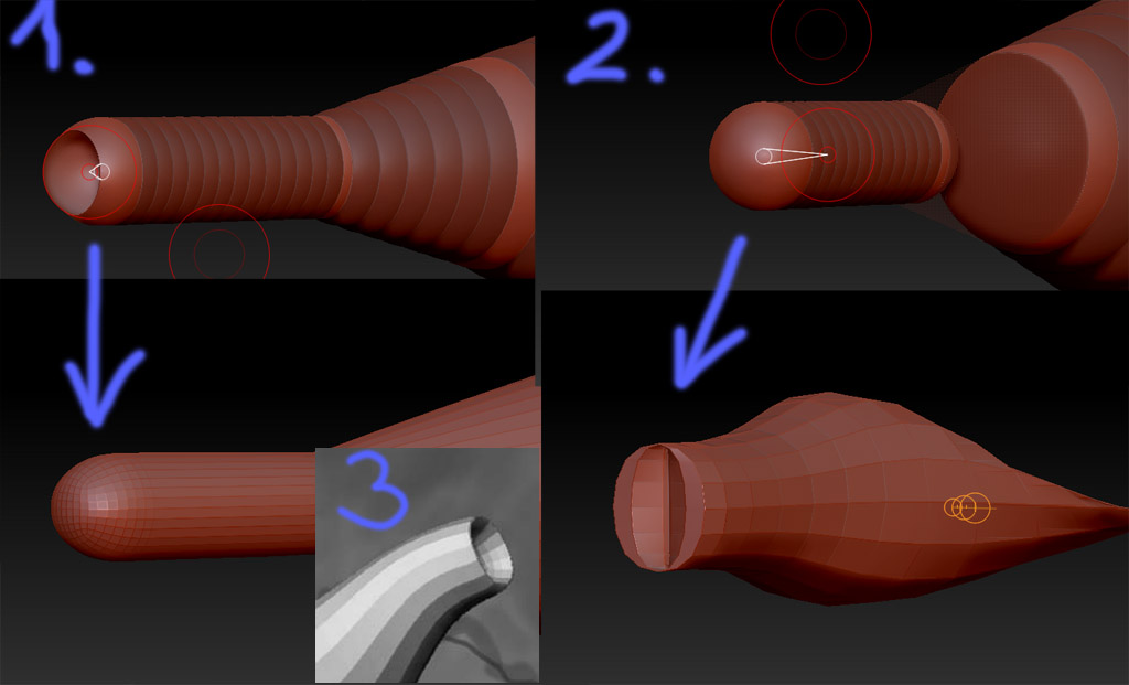 I would like to make a small crater with zspheres as you can see the pic 3. If I pull back the last zsphere a bit into the previos one, it won’t be enough (pic 1). If I pull it more, the crater will start appear (pic 2), but it looks non symmetrical, even if I use the shift key and the symmetry options in the transformation menu, so the last sphere is on the mirror line. What is my mistake? How can I do that?