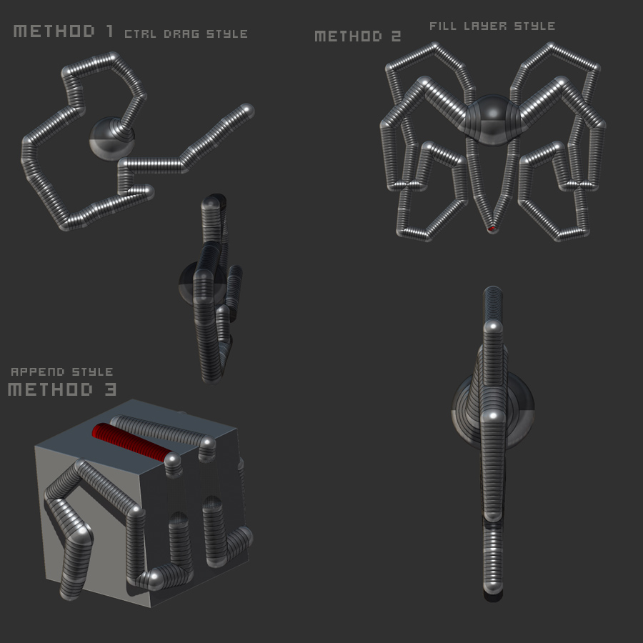 Once you’ve got a good side view or front view or whatever, then start drawing your next zsphere. Don’t let go of the mouse/tablet, while keeping it still pressed down, tap ctrl and you can spin the zsphere around to the angle you want. When you release ctrl, you have the ability to draw zsphere lines constrained to that axis. Holding shift allows you to draw straight lines. Moving the mouse/pen quickly will add many zspheres to the chain, slowly will add fewer.