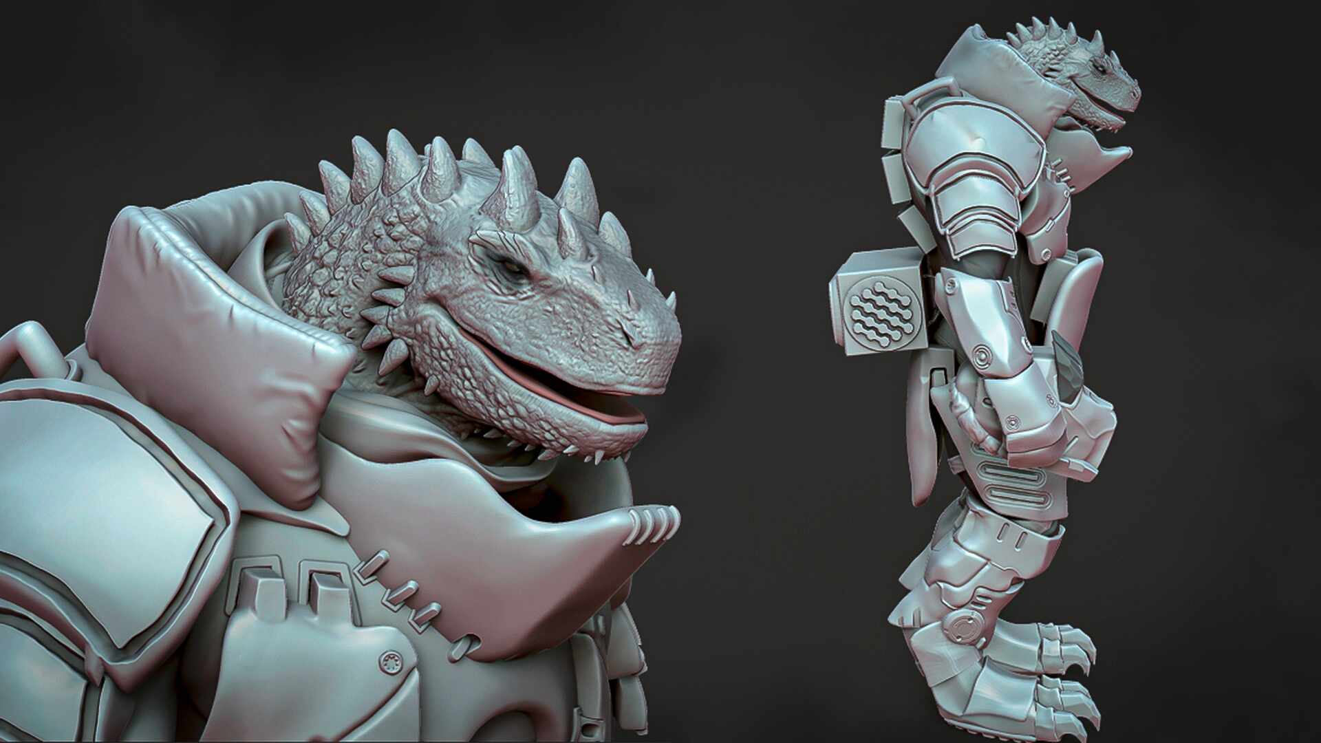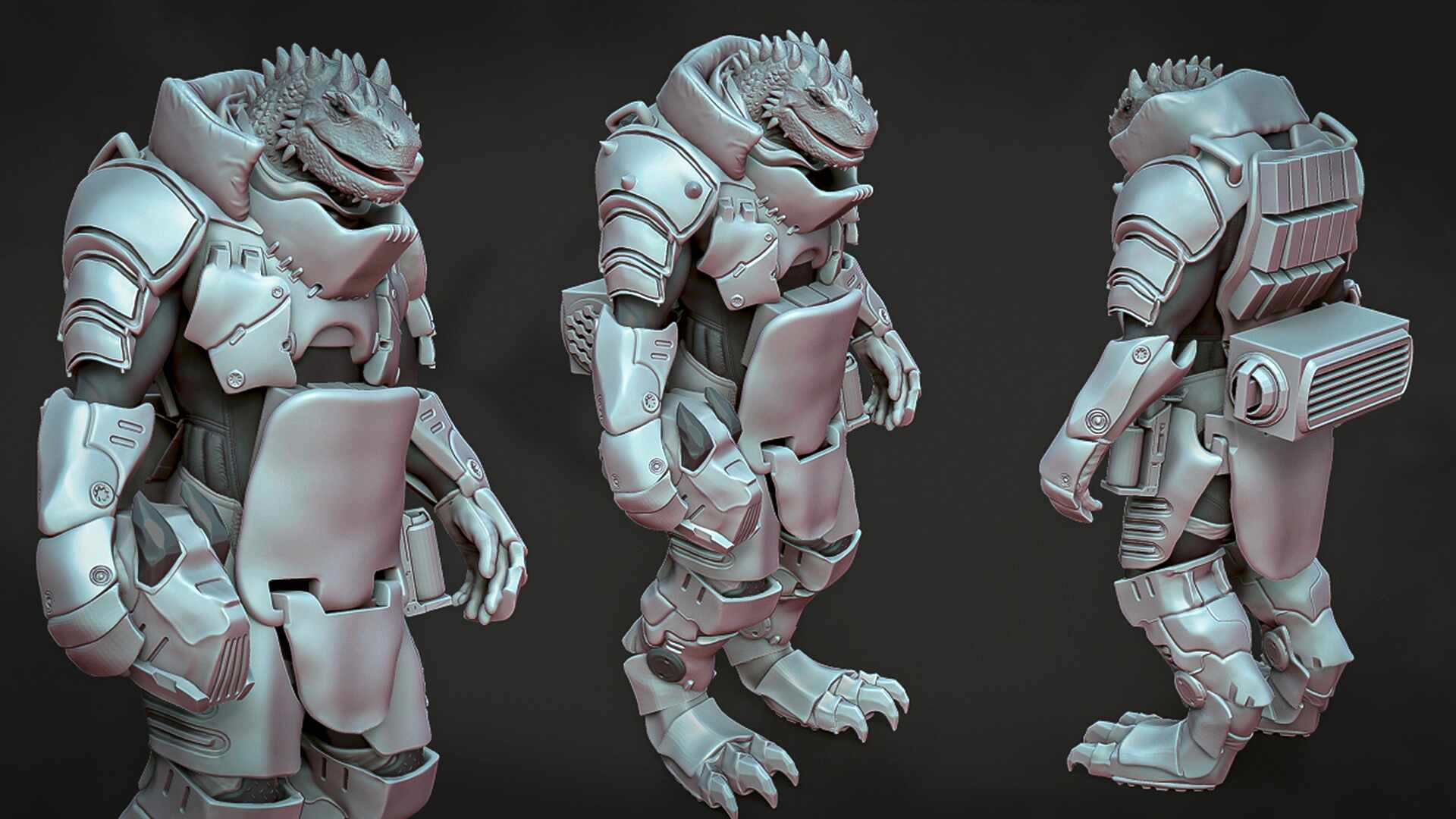 High-poly model concept art of a Dinosaur character in heavy armor that allows him to be on the frontline of a battlefield