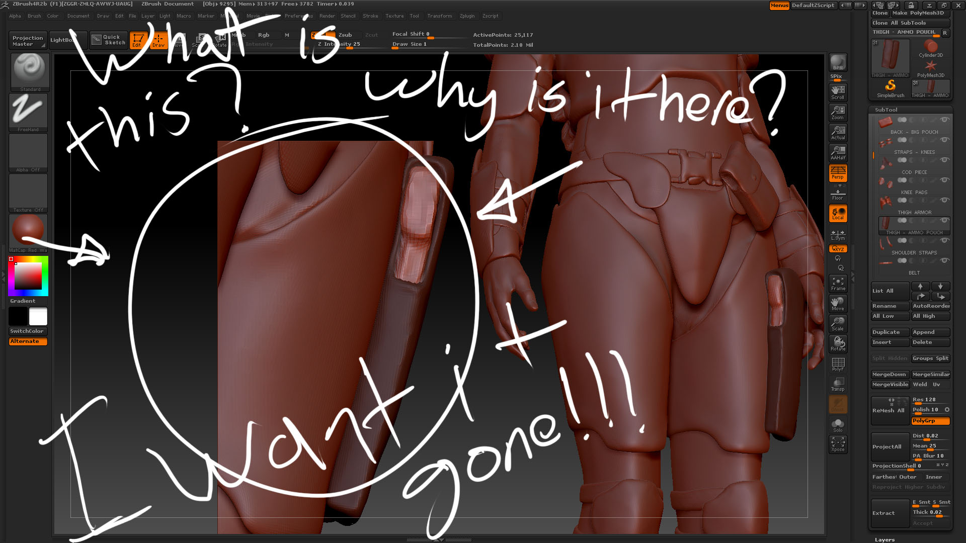So I’ll admit I have no idea what happened here, or how to mend the issue; I started working on a small section and then when I went to rotate…I found this sectional chunk just kind of floating in mid-space. Can’t do anything with it (sculpting or otherwise), I know there has to be some trick for getting rid of it, I saved the file (under a new name) and when I reopened it it was still there. Quite aggravating when you don’t know all the mechanics of the program.