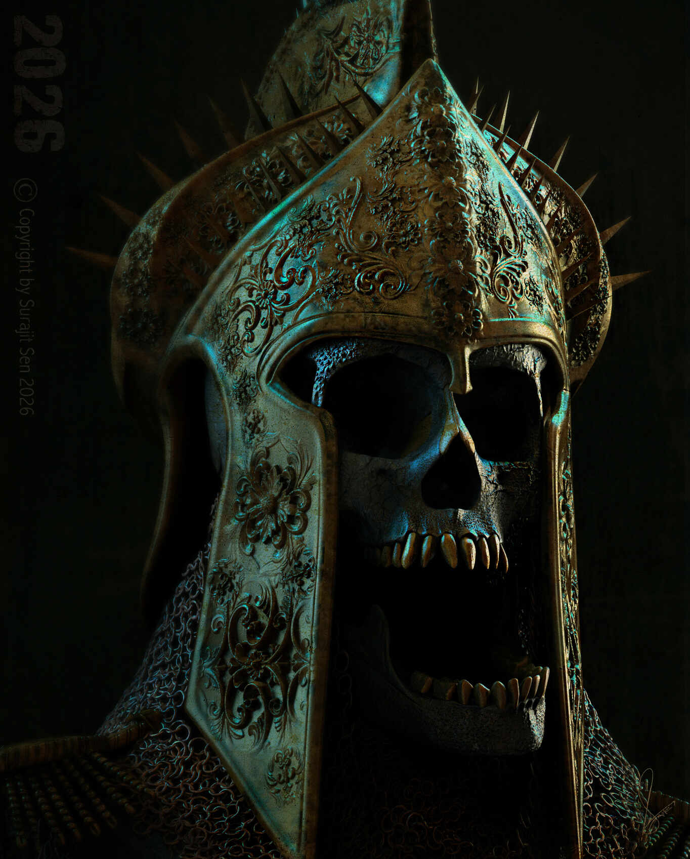 The ornate armour represents the vanity and glory of conquest, while the exposed skeletal form reminds us of the inevitable silence beneath every crown.