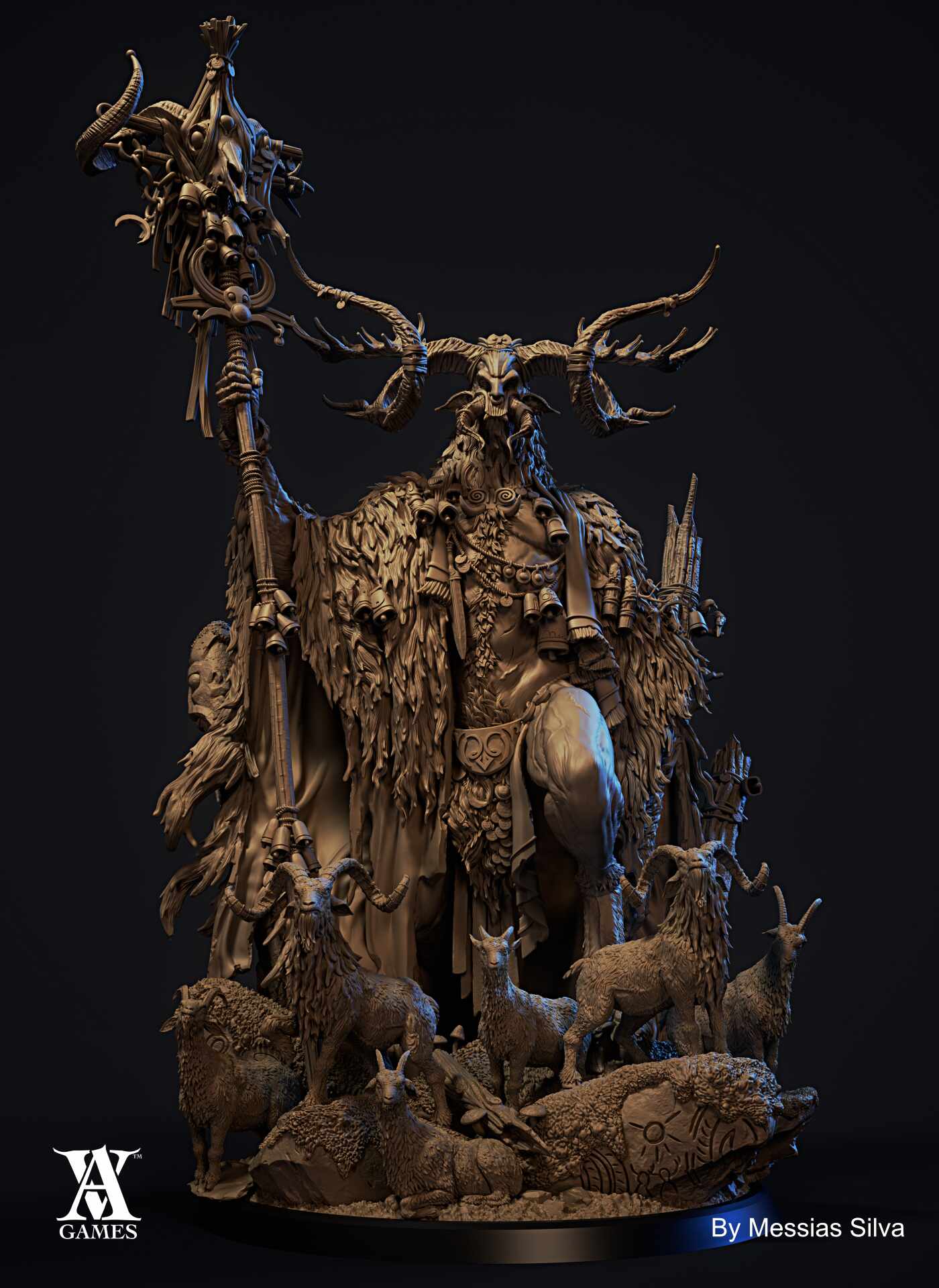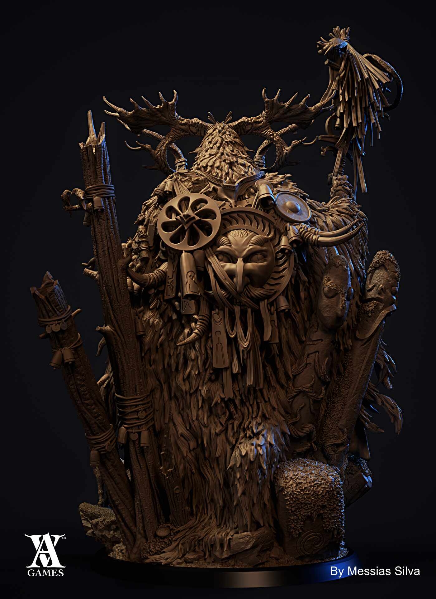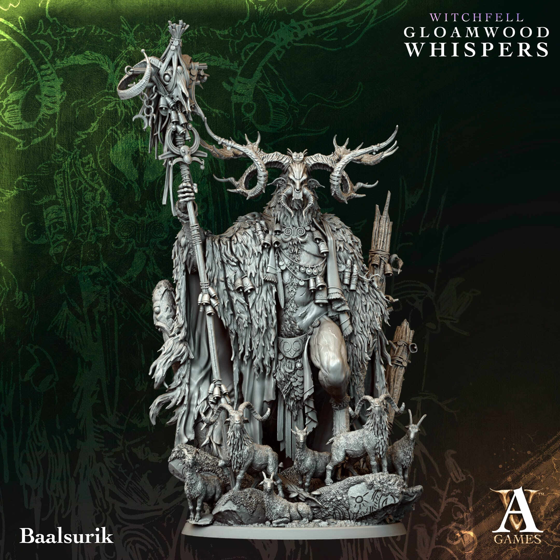 Every detail — from the organic texture of his cloak to the symbolic weight of his talismans — has been meticulously sculpted to convey the ritualistic aura and ancestral dominion of Baalsurik over the Gloamwood.
