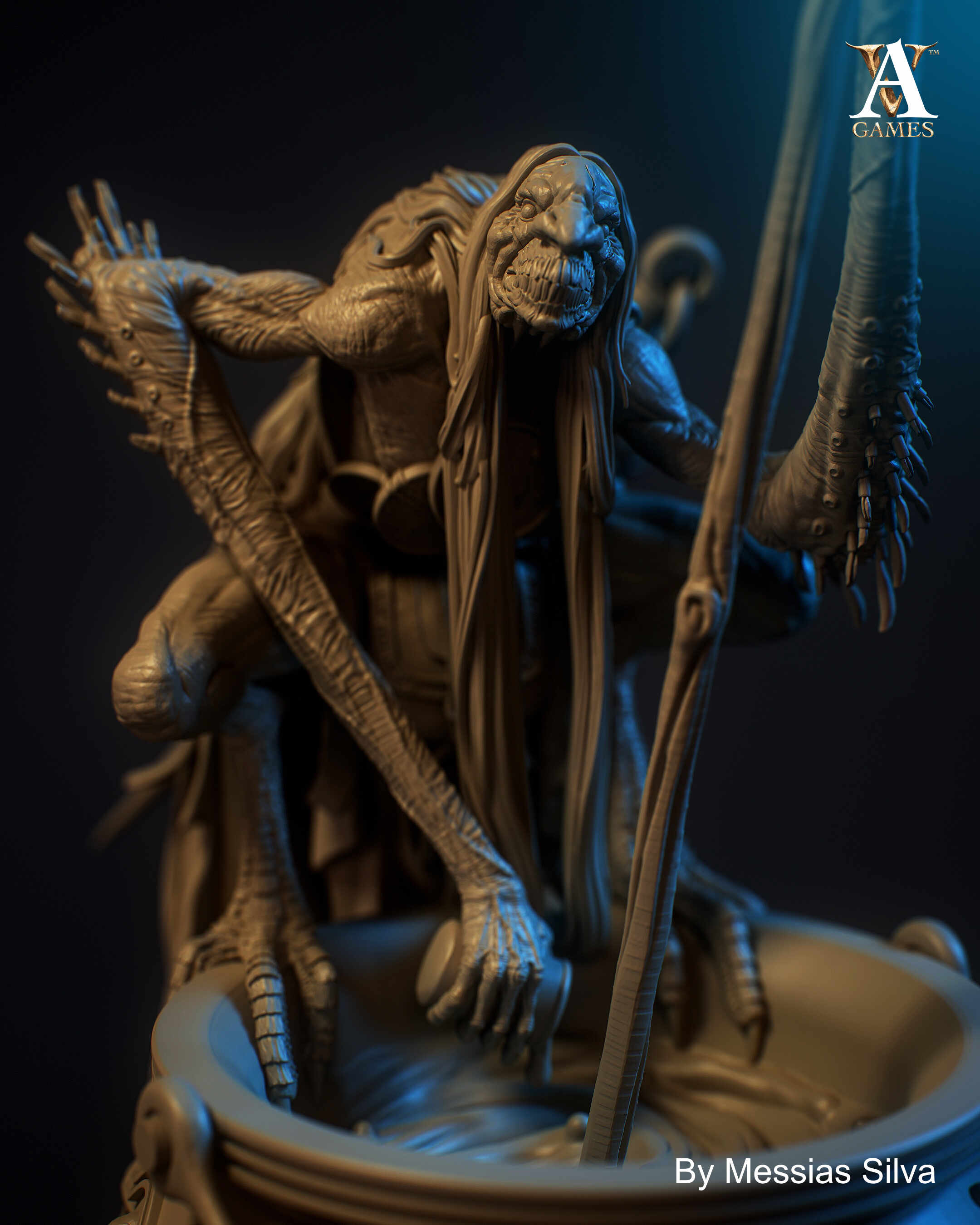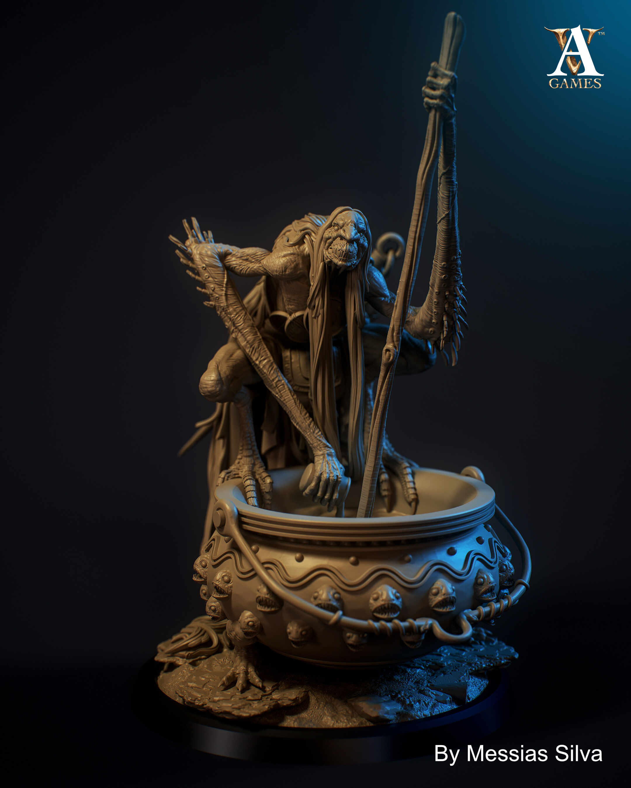 The cauldron received special attention: its ornaments, reliefs, and surface textures were designed to add visual rhythm without overpowering the main figure. The interplay between organic and decorative elements enhances the contrast between the grotesque and the ritualistic tone that defines the piece.