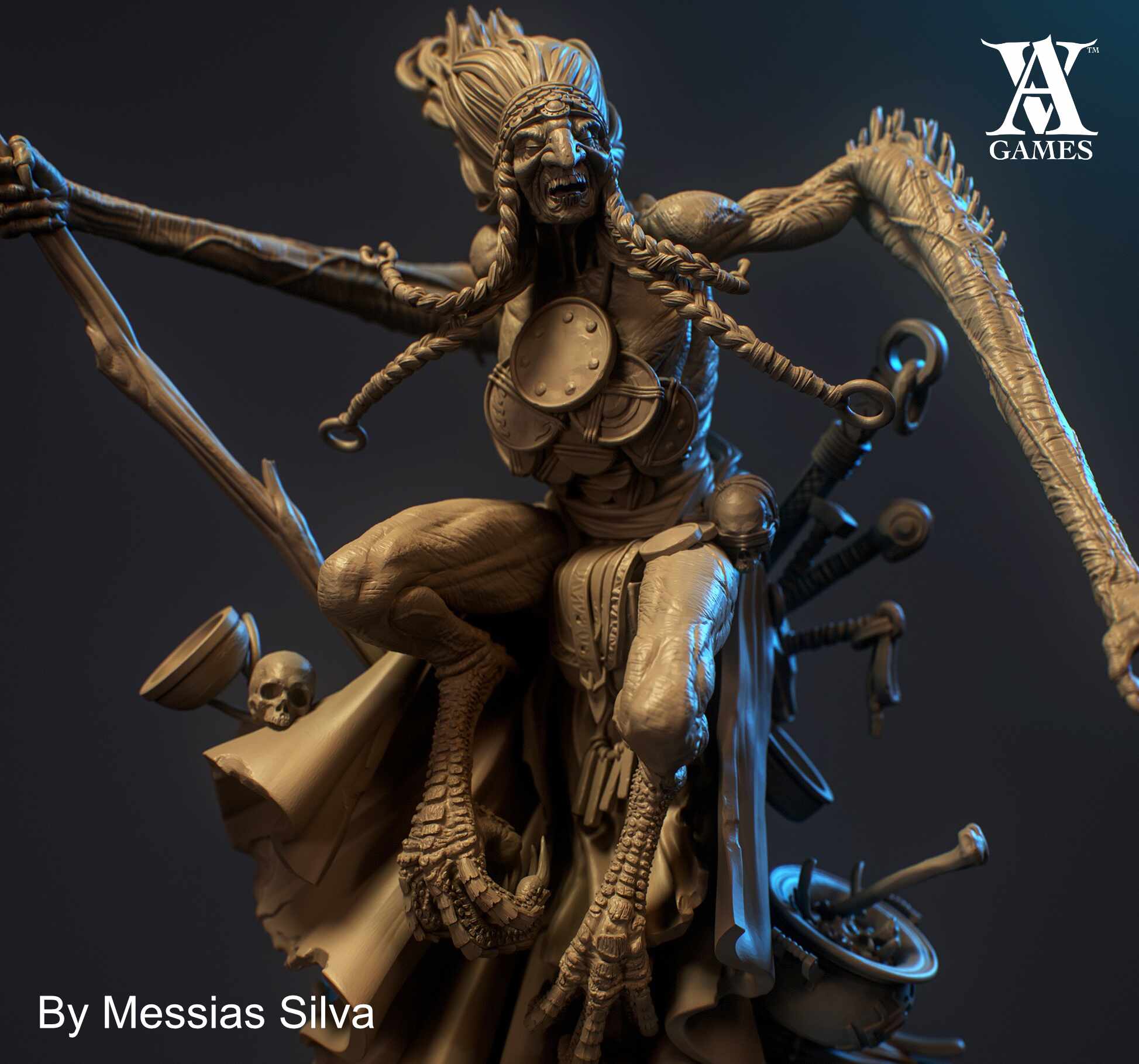 The base was built to complement the ritualistic theme of the bundle, blending organic textures, bones, and subtle narrative fragments into a cohesive composition.