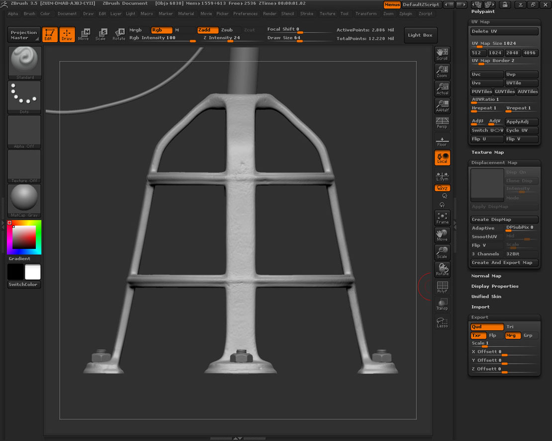 I have also attached a shot of the mesh in Maya with a better UV layout. However, apparently the shape of the mesh had changed slightly from the mesh I used to fix these UVs. So, if I try to import this UV in to the tool in ZBrush the tool gets even more distorted. I’m sure there’s a work around for this (the point order is the same) but I don’t know ZBR enough to know how to do it.