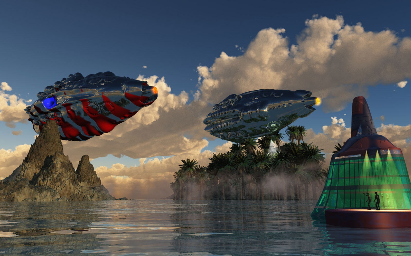 looks like the geen building bobing in the water but no waves