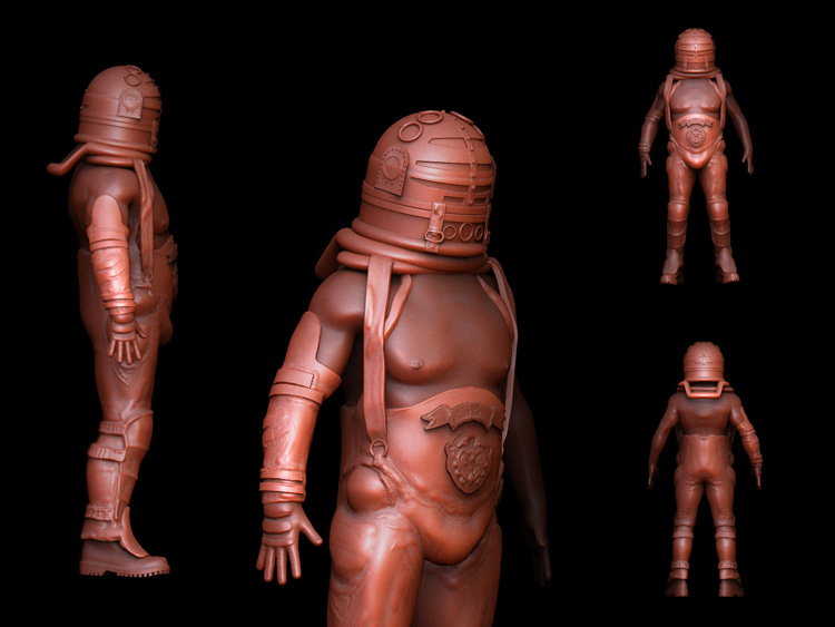 I still have to finish the “Master” but here is Blaster, still a wip with some retouching but the main sculpting and retopo is done. The only reference I had to go by was this model pic that Im postingand after looking at it I see the watch/strap ting and the closed left fist arghhh:mad:
