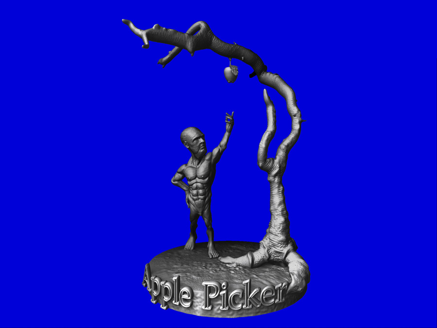 I like the apple picker the most but the tree seems off to me. Maybe a bit more height but the branches are way too thick at the top. The place where the tree is losing control is just below the Y and up except for the apple itself. Maybe do a shadowbox for rough shape on the tree, then do a remesh in subtool, relax the shape and then pop it in sculptris to draw out a more natural shape. Then back to Z for detailing. I love that one shot where he is willing the apple to drop