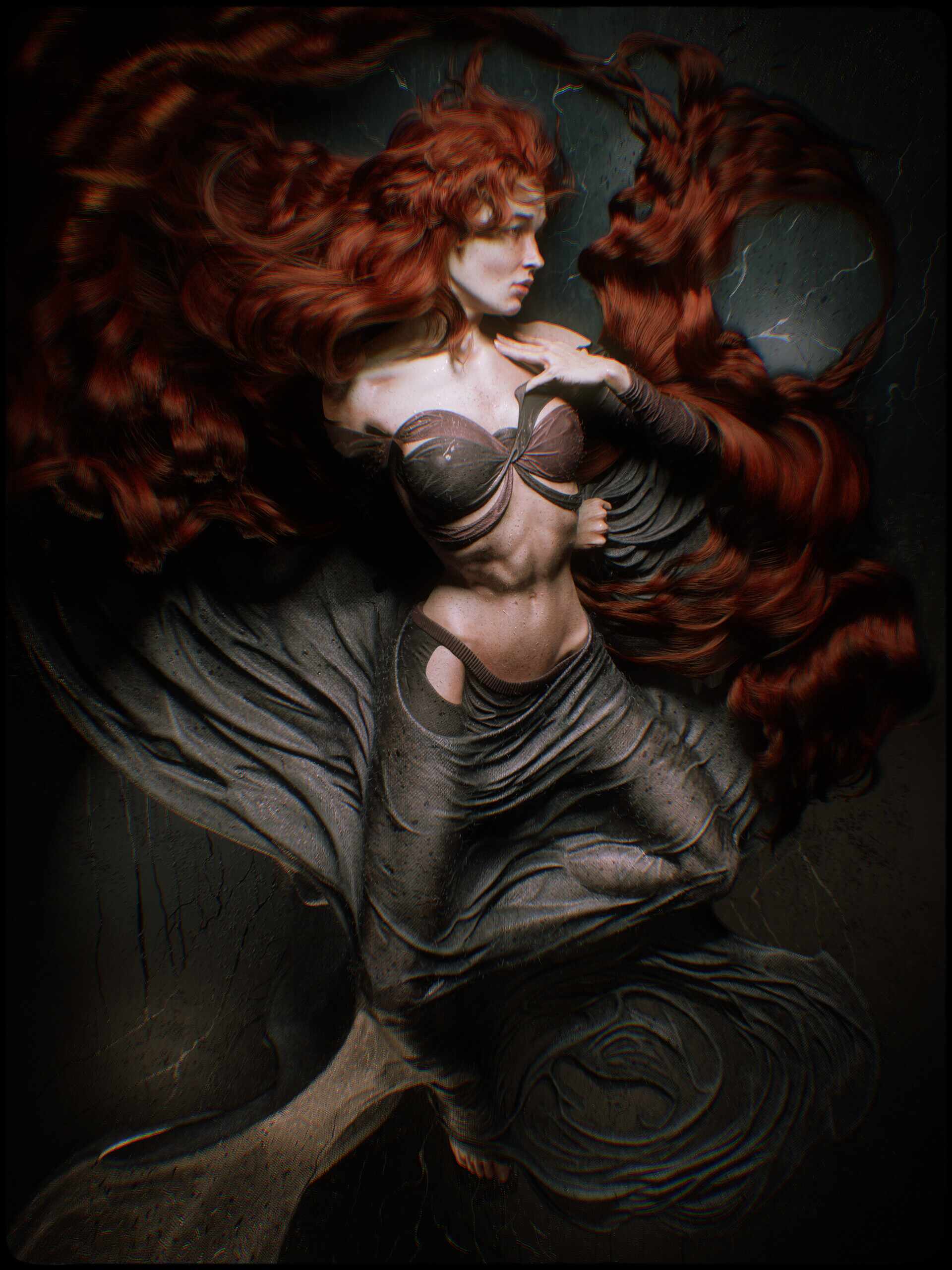 3D - cloth sculpted by hand, rendered in marmoset, hair in xgen. This one is not optimized but I used the Metal-rough workflow directed at games