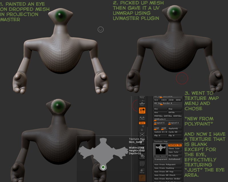 Anyways, im having problems understanding textures. Or more so, how to apply a texture just to one piece of the model, say like the eyes. Im also having a real hard time understanding projection master. All i can find are these old tutorials from zbrush 1.5 and 2.0 on you tube and whatnot.
