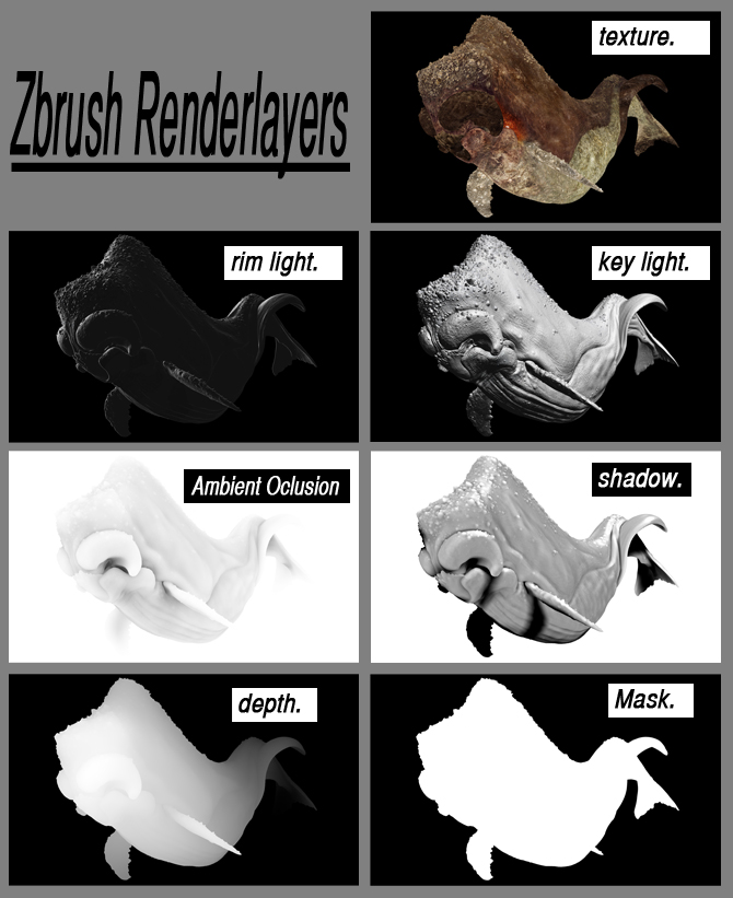 Thanks for the comments. I rendered the whale in zbrush using just the basic material, and tweaking the lights. Here is the different render layers I used.