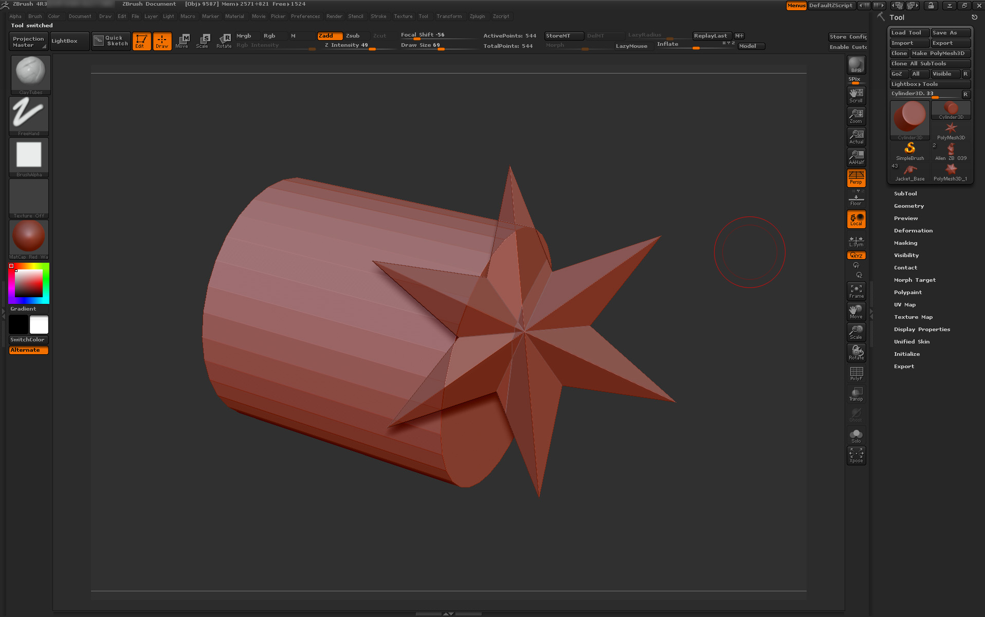 I’m having a weird problem with ZB. I was sculpting, and I don’t know what strange key I pressed by accident, but not only I seem to have bathed everything in an ambient light that won’t go away, (even if I re-start) making all materials look overly bright, but also, more importantly, ZB is ignoring me when I try to sculpt. I can still move, rotate and scale subtools, but not sculpt on them. It’s not even showing me the usual red dot in the middle of the mouse pointer circles. Also, Ztools have become somewhat transparent, which might be a clue to whatever crazy mode I’ve got myself into. And yes, all this happens no matter how many times I re-start ZB.