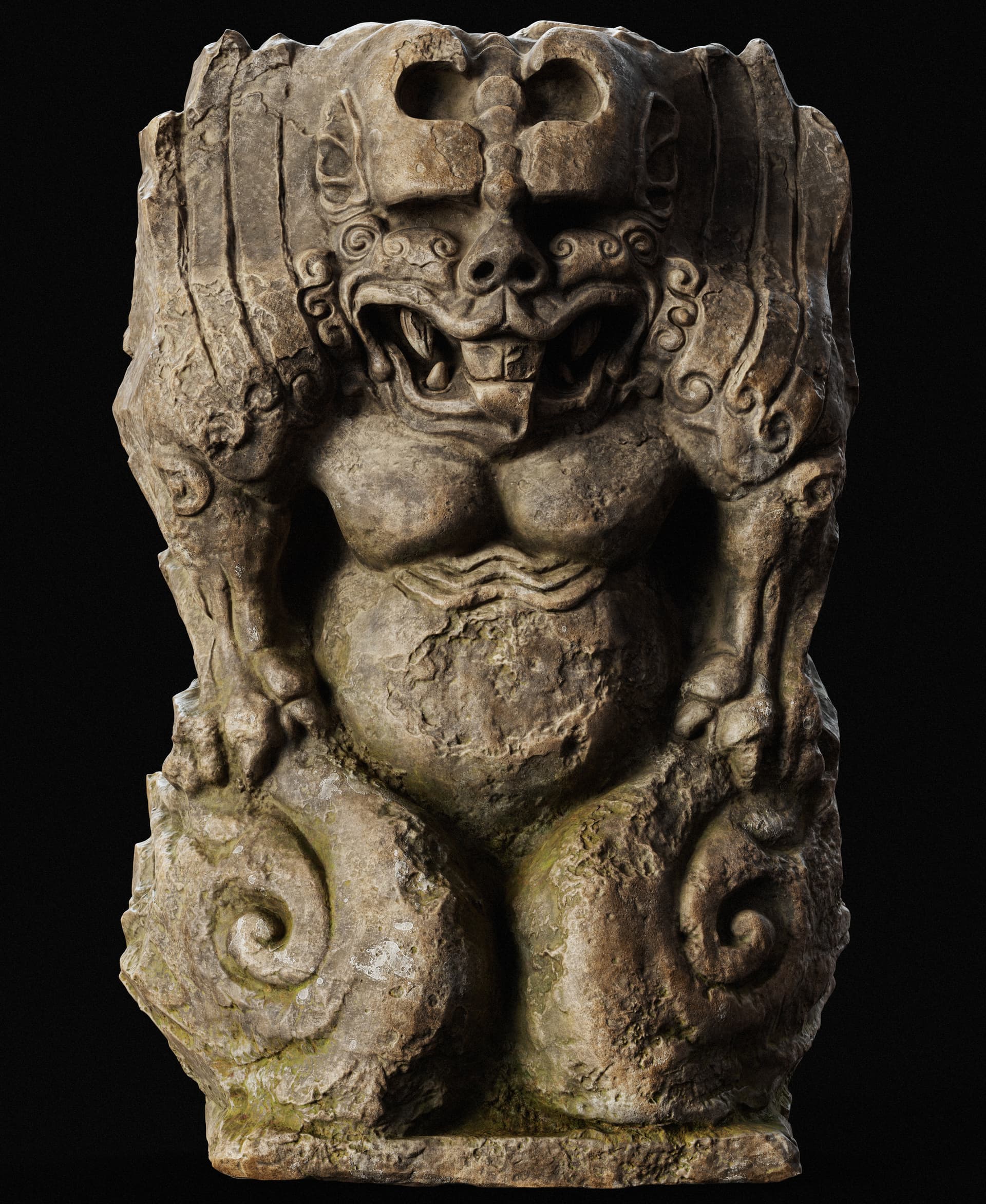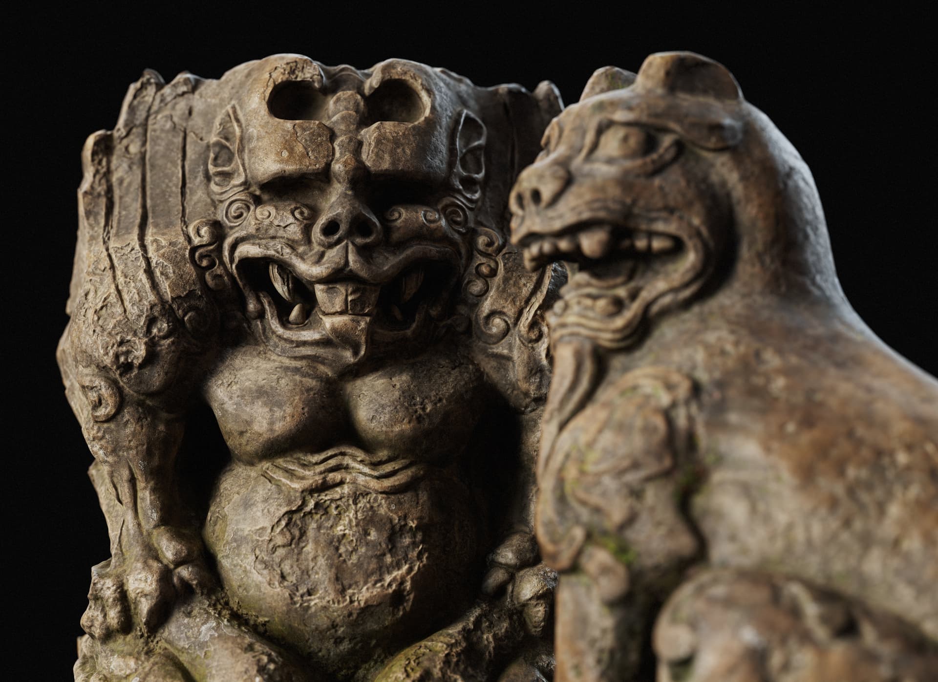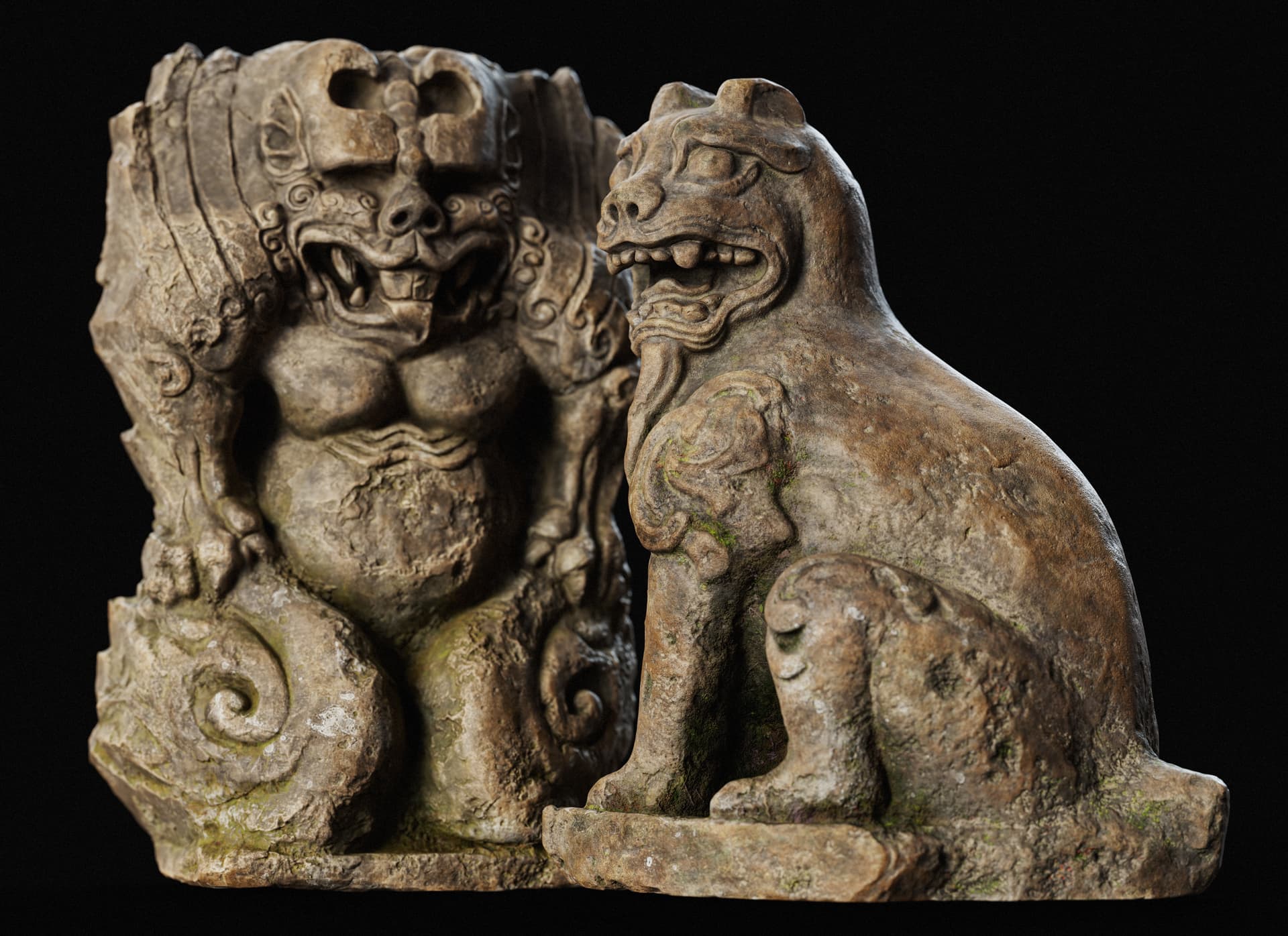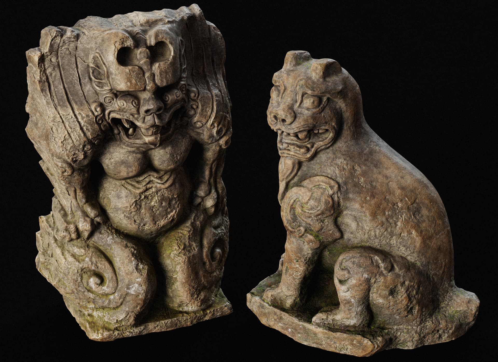 This is a set of Chinese stone carvings I made. I sculpted it in ZBrush, painted the textures in Sprites, and rendered it with Marmoset Toolbag 5. It took me about a day in total. I handled the weathering and erosion, aging and mottled appearance of the stone to make it look more historical.