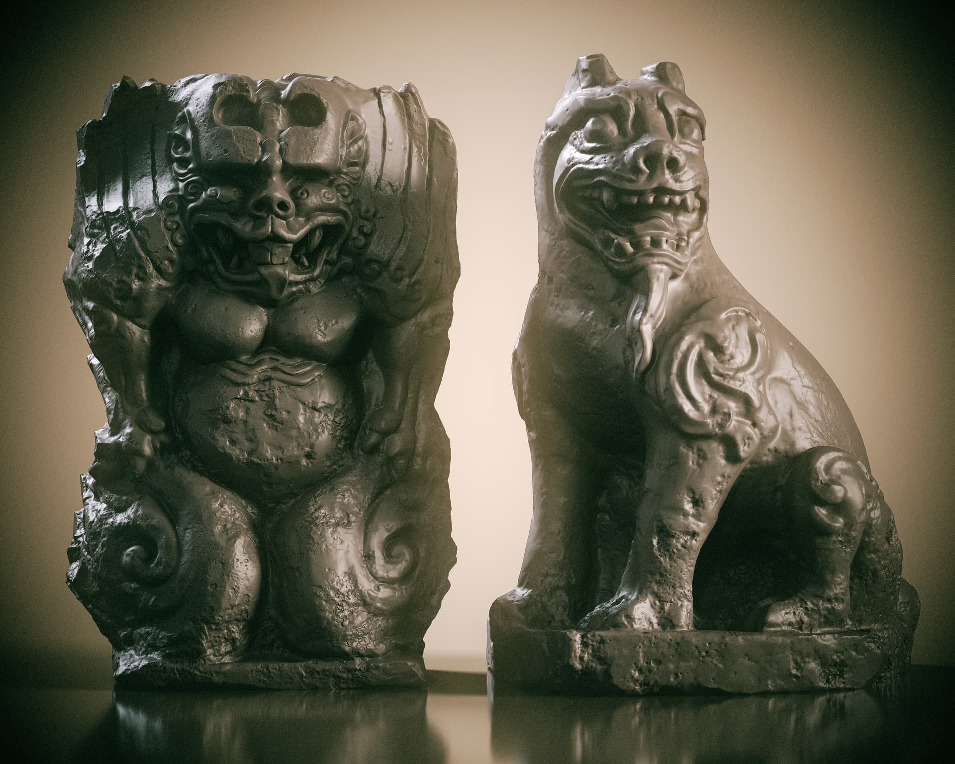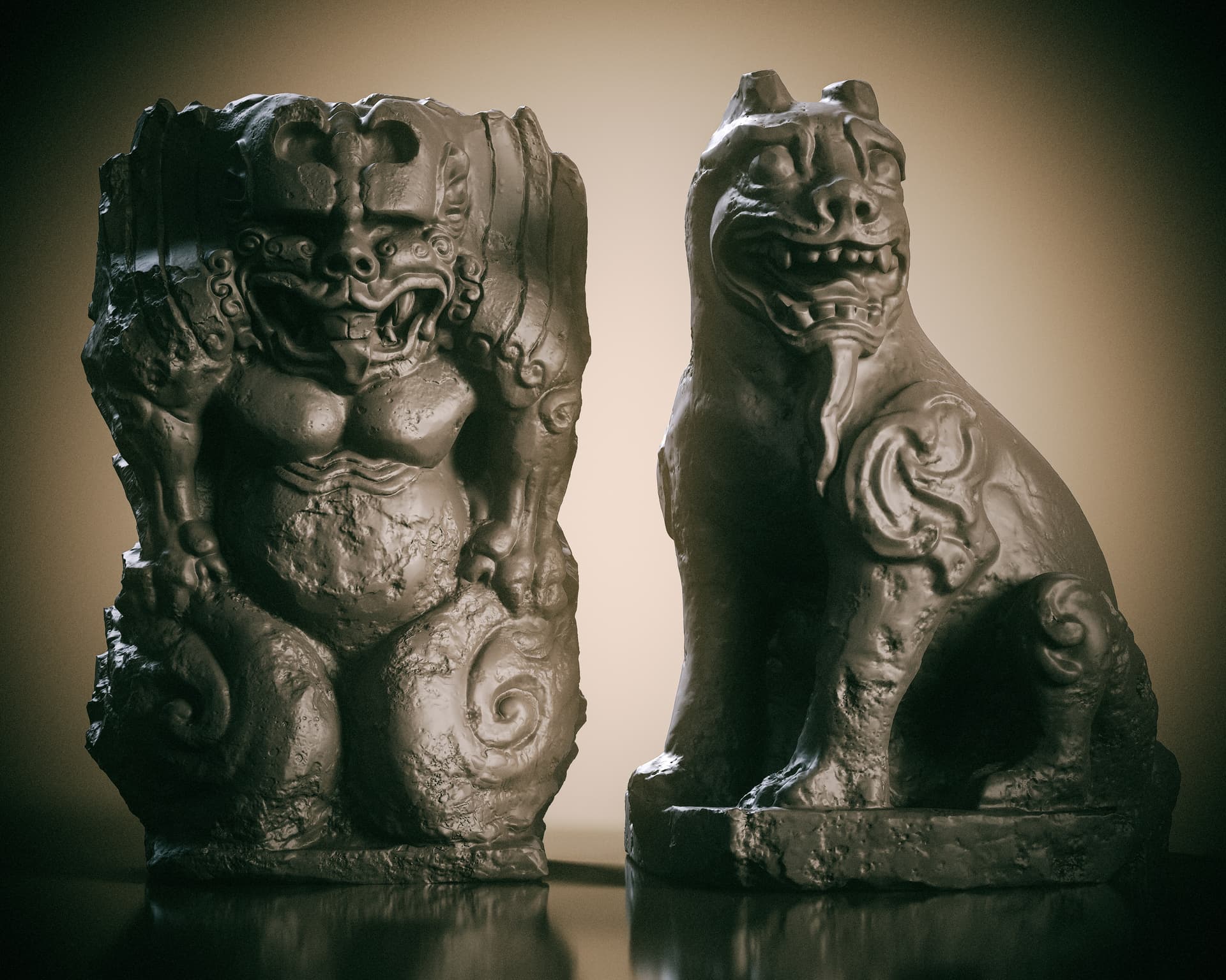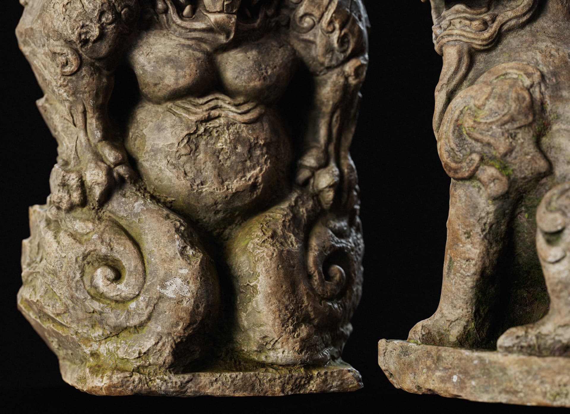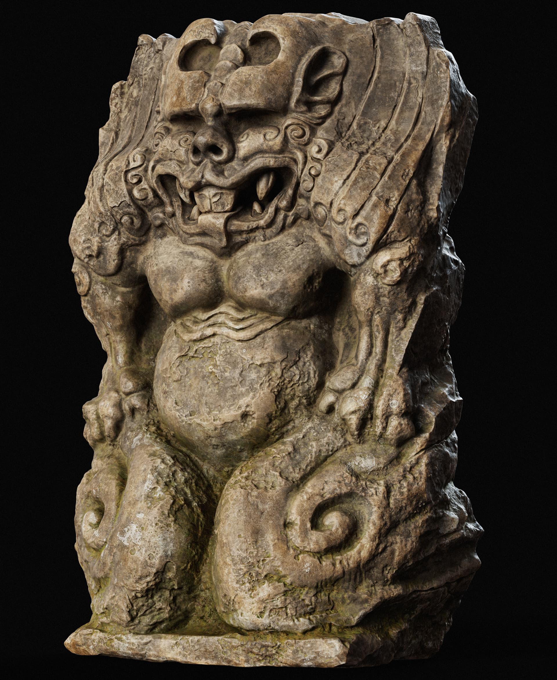 This is a set of Chinese stone carvings I made. I sculpted it in ZBrush, painted the textures in Sprites, and rendered it with Marmoset Toolbag 5. It took me about a day in total. I handled the weathering and erosion, aging and mottled appearance of the stone to make it look more historical.