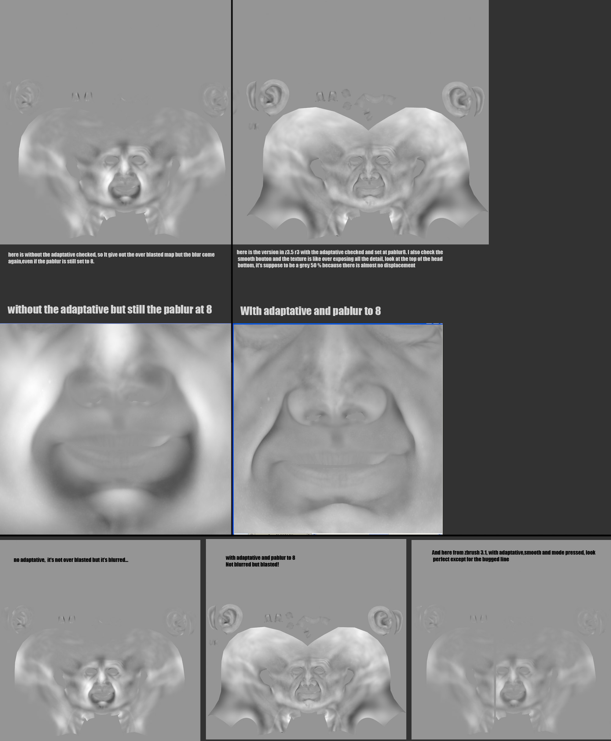 On the other hand, in the 3.5 r3, it’s not doing a good job! ok the bug of the line has disapear like magic, but the map itself do not displace the mesh correctly and I have tried with 4 of my other mesh that work well in z3.1 and they all have the same problem! Look at the pictures you will understand.