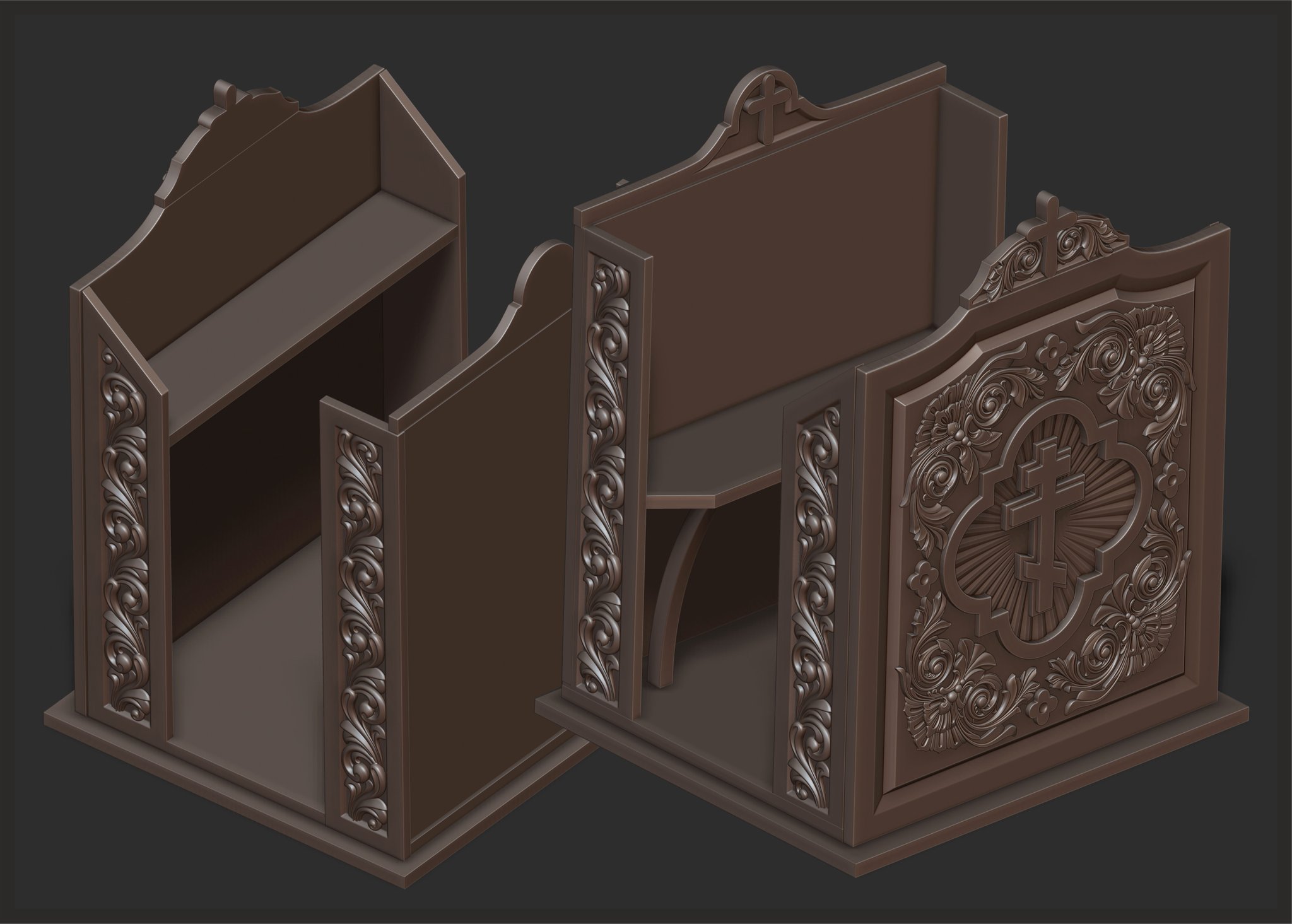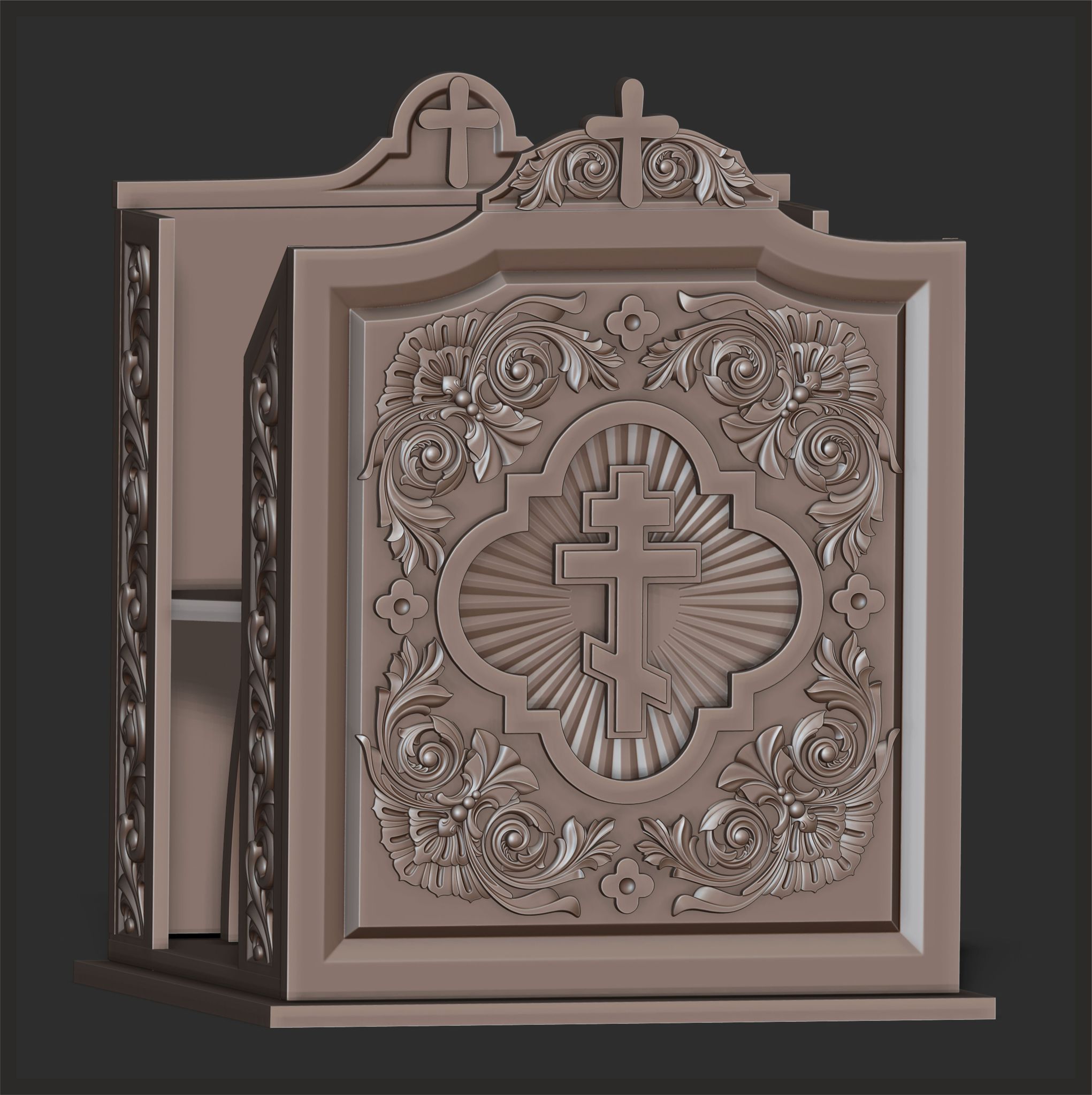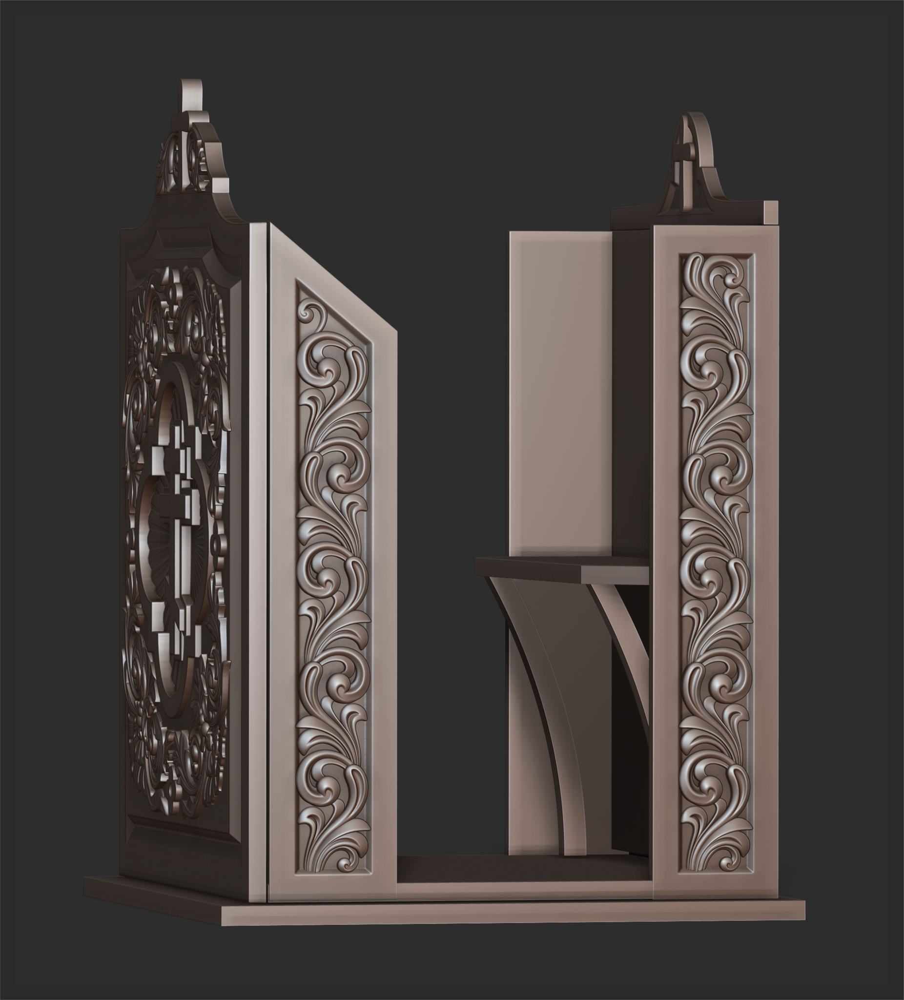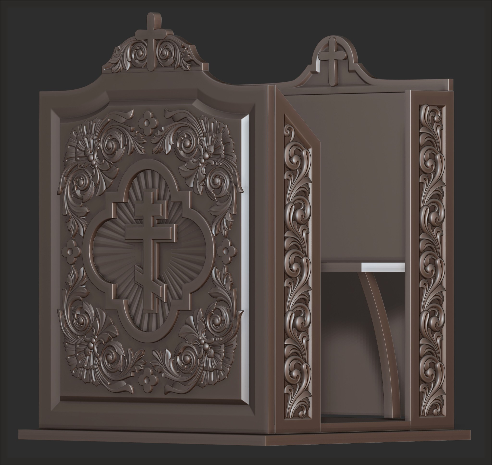 A podium for a speech in an Orthodox church. The project will be made of wood using CNC technology. 3D modeling was done in ZBrush. I will definitely share the finished results when the work is fully completed.