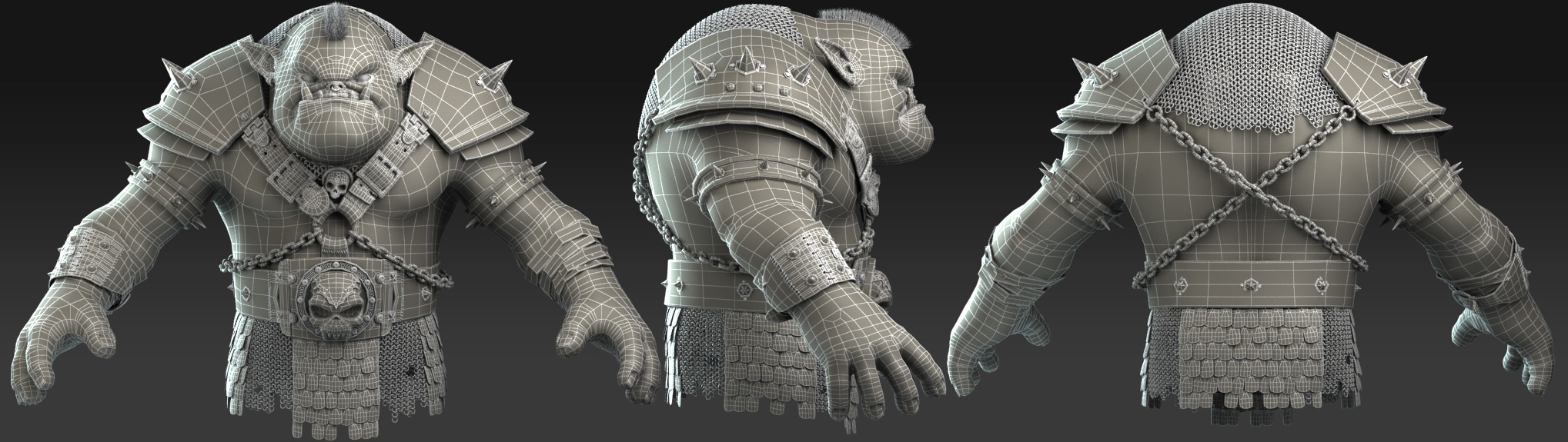 As for the general workflow, I usually start with a rough basemesh in Max, take it to ZB for what I call first phase modelling, this is where I rough out the basic shapes, proportions and volumes. I then get this approved by the Director and beging second phase modelling, which involves working closely with the rigger to re-topologise the mesh. I then pass the model onto rigging, while I concentrate on the UV’s, displacements and textures. I usually add all of the high frequency detail in zbrush as a normal map, it’s important to treat this phase as a texturing task. Tiny bumps and wrinkles are not considered a part of the modelling process.