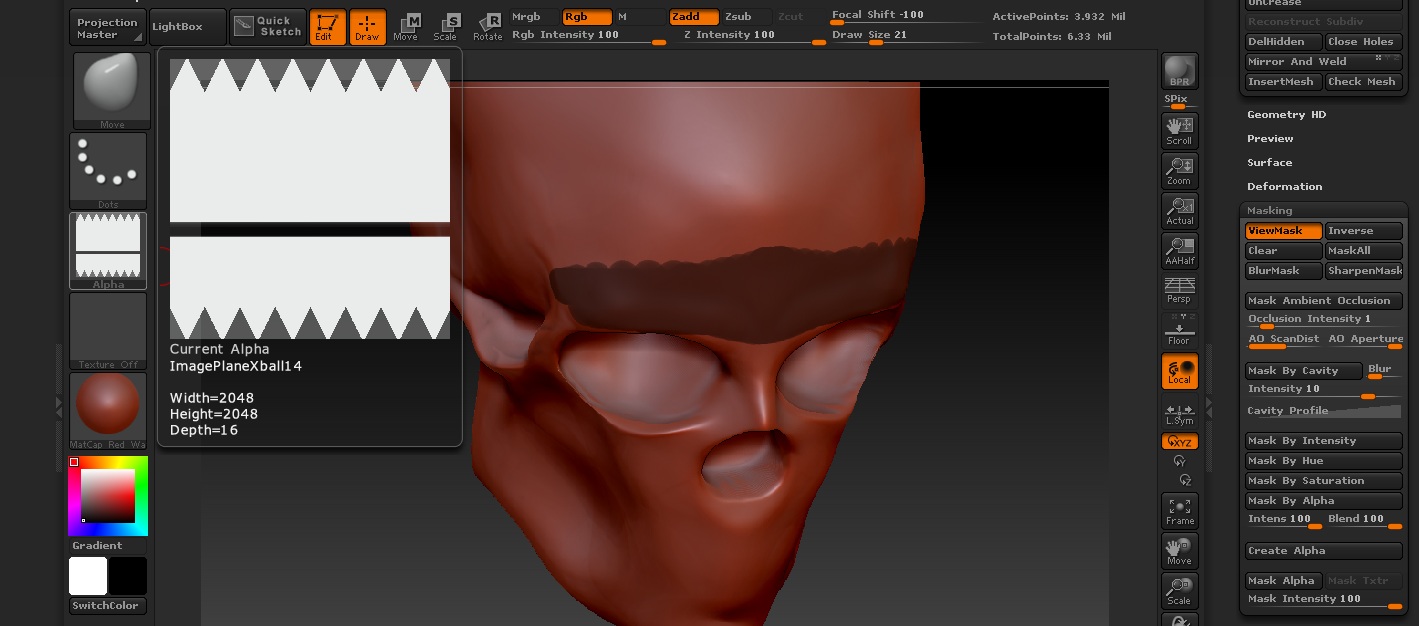 When I create a mask and hit Create Alpha in the Mask submenu, it creates either a sort of diffuse full screen gradient as an alpha or something like below. So if I mask out the eyeballs (or lack thereof in this case) and try to save that as an alpha to use later what I get is useless: