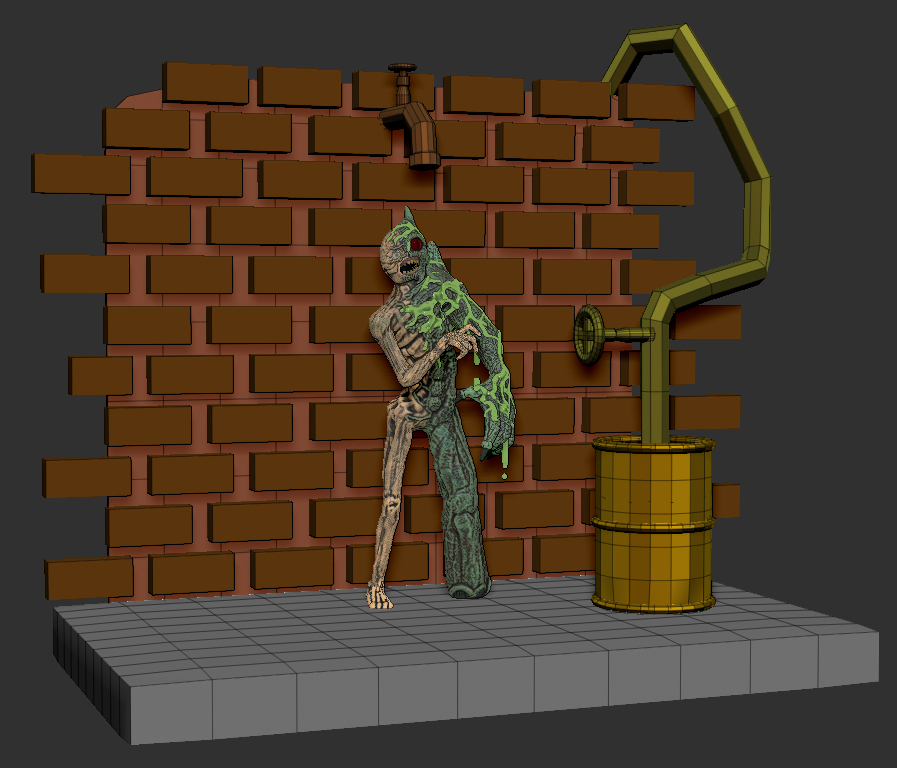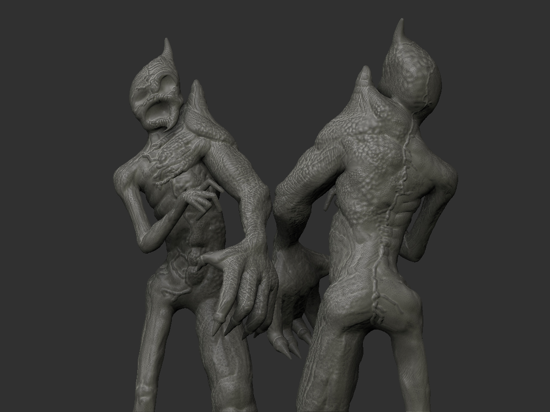 I worked from lowest SubDs to the highest shaping him as I added resolution. My wife noticed the same block like stockiness you mentioned. I was sort of going for a William Birkin/G-Virus monster look… sort of… scrawny but then… almost elephant/stump-like monster side, lol… I took your advice and rendered this out for you to take a look at.
