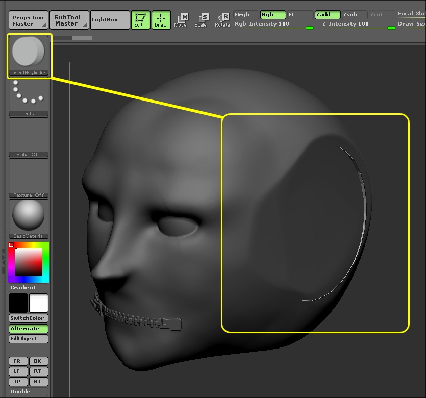 As instructed in ZClassroom video “The making of Time for Art” I am trying to cut dynamesh using insert cylinder, pressing ALT but it doesn’t work. Am I missing something?