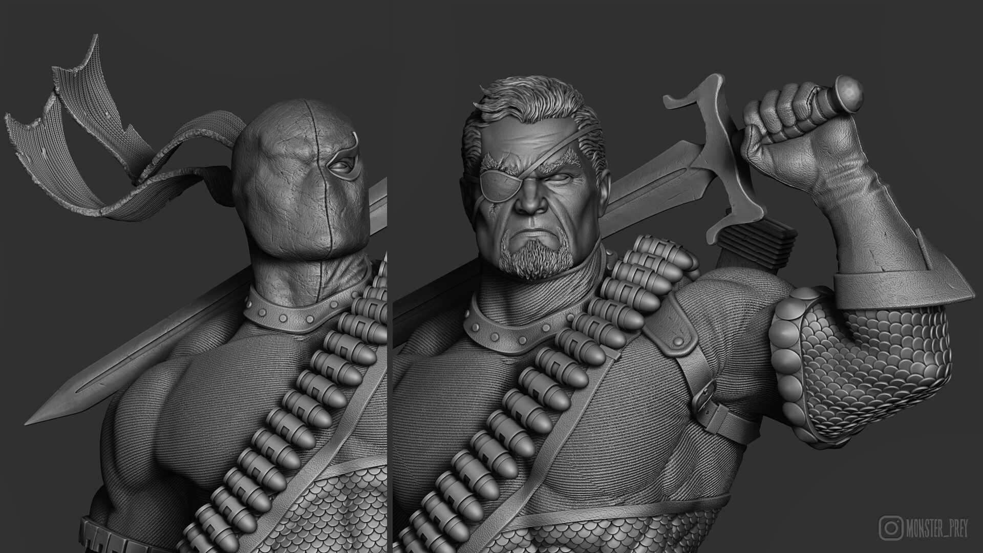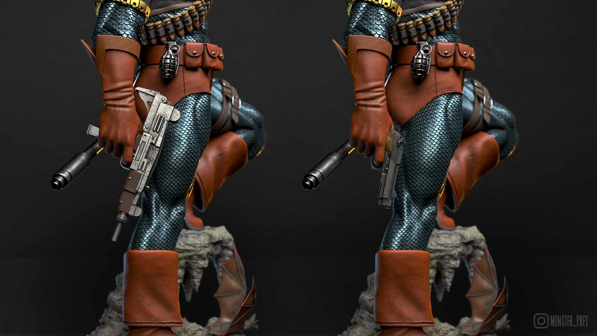 I was inspired to create this sculpture by some fan art I found online, unfortunately, I don’t know the artist’s name. It was a good fit because I wanted to make a statue. I found a lot of Deathstroke action figures online, but almost none in a museum pose. And of course, I paid special attention to his classic costume and equipment. In the old comics, he had a sword, a pistol, and a stick on his belt.