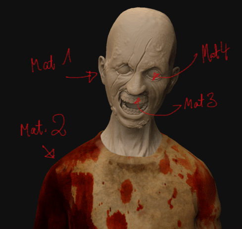 I thought of painting a texture for each subtool and use different materials for them, because the eye needs more reflection than the shirt and so on…