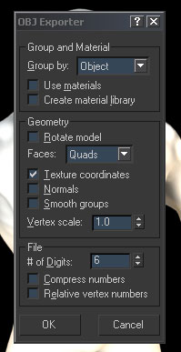 1 - I exported my model out of 3DS Max using the default .OBJ export options (with Poly). I made sure I collapsed my UV Unwrap to the Poly before exporting.