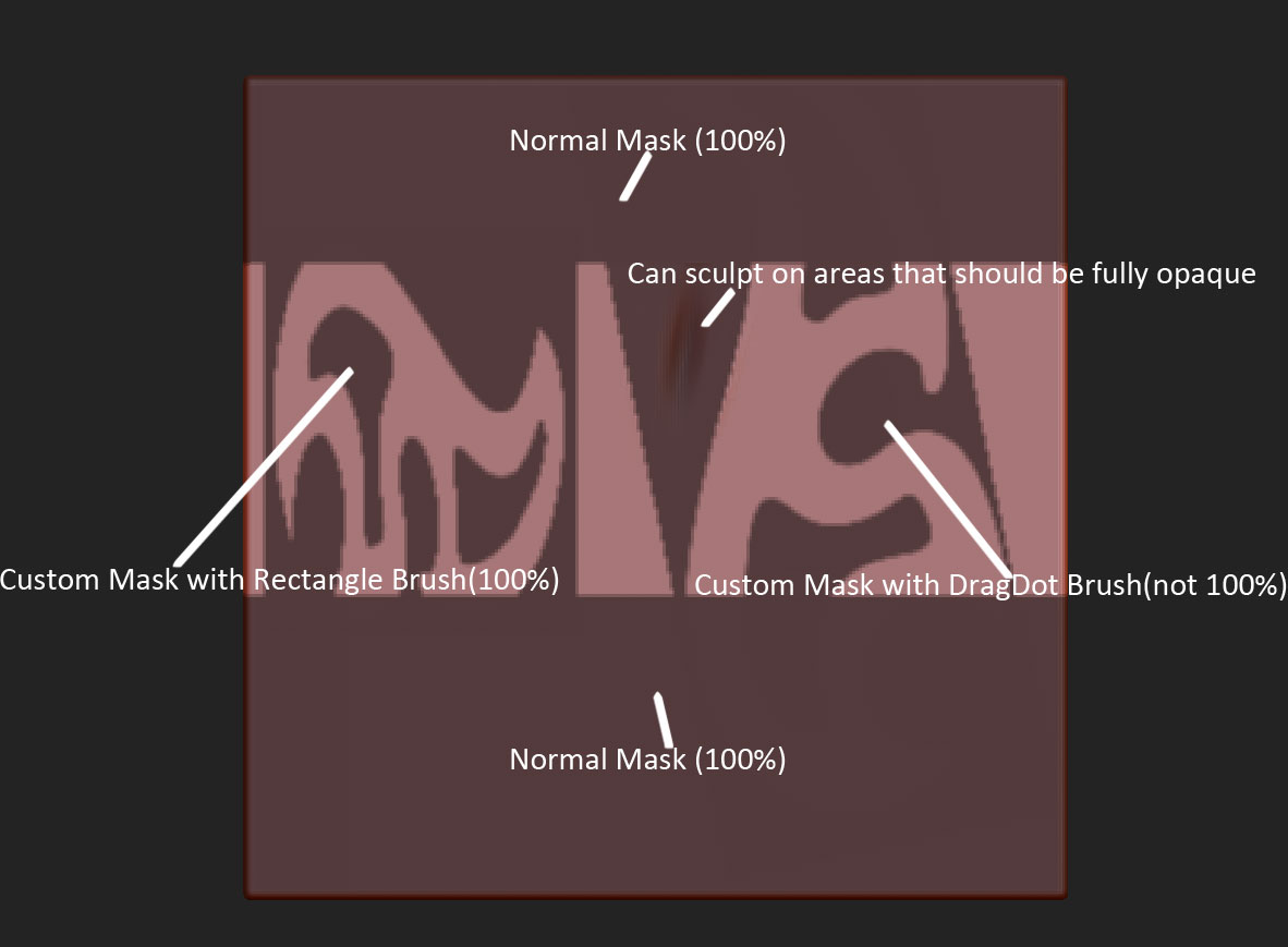 When using a custom mask and applying it to a model using the DragDot or DragRec strokes, the mask seems to only be applied at ~90% opacity. Sculpting on areas that should be fully masked out still allow the brush to affect the surface. The Rectangle (not dragrec) stroke does apply the mask at full opacity, but the downside is that you can’t rotate this brush.