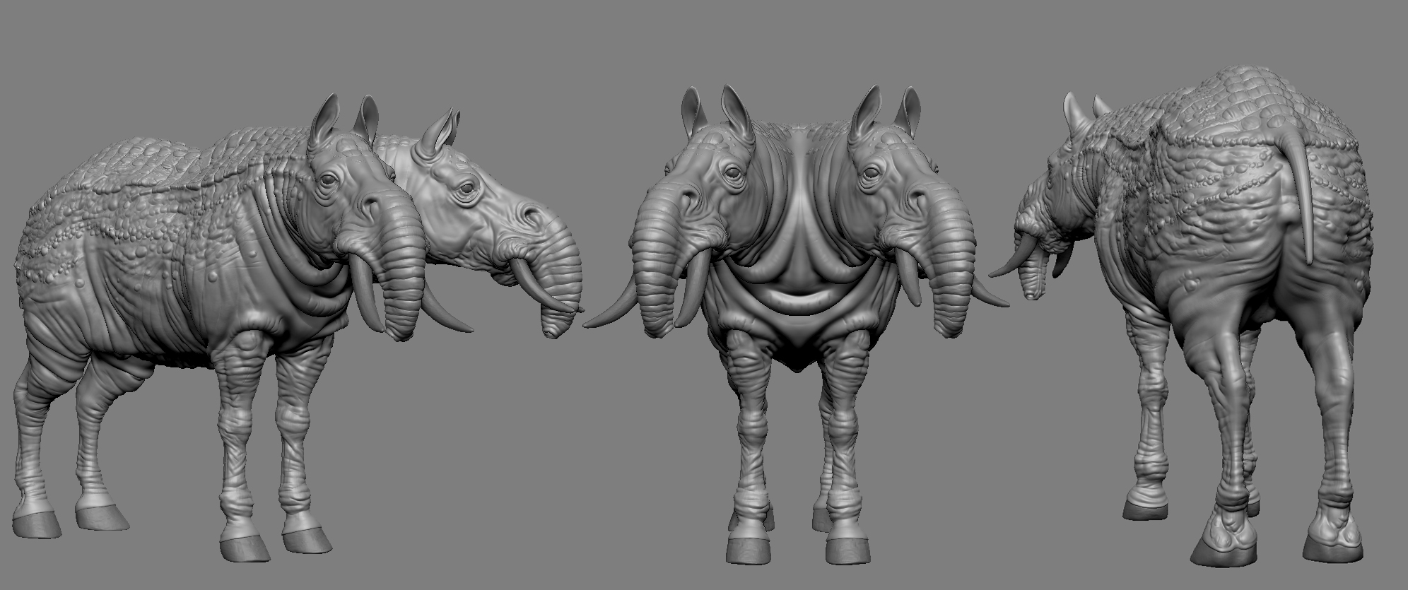 I wanted this project to be in the continuity of the Gorillon, like both could be living on the same planet. Though the Elephorse lives more in a tropical environment. Quite a peacefull creature but due to her size she has really few predators.