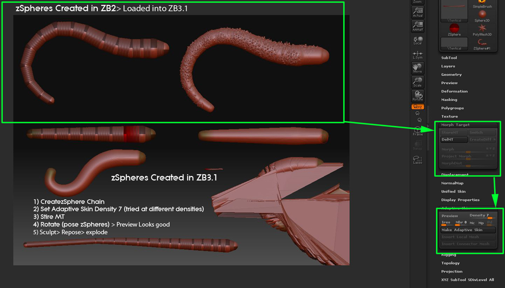 It has been my experience that If zSpheres are created in ZBrush 2 then loaded into ZBrush 3.1 the Morph Target> Switch will work regardless if your supposed to do it or not.
