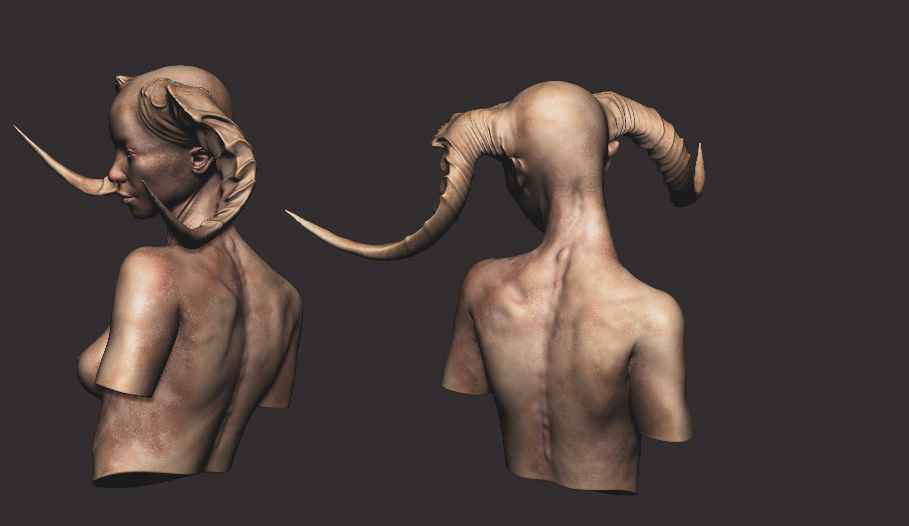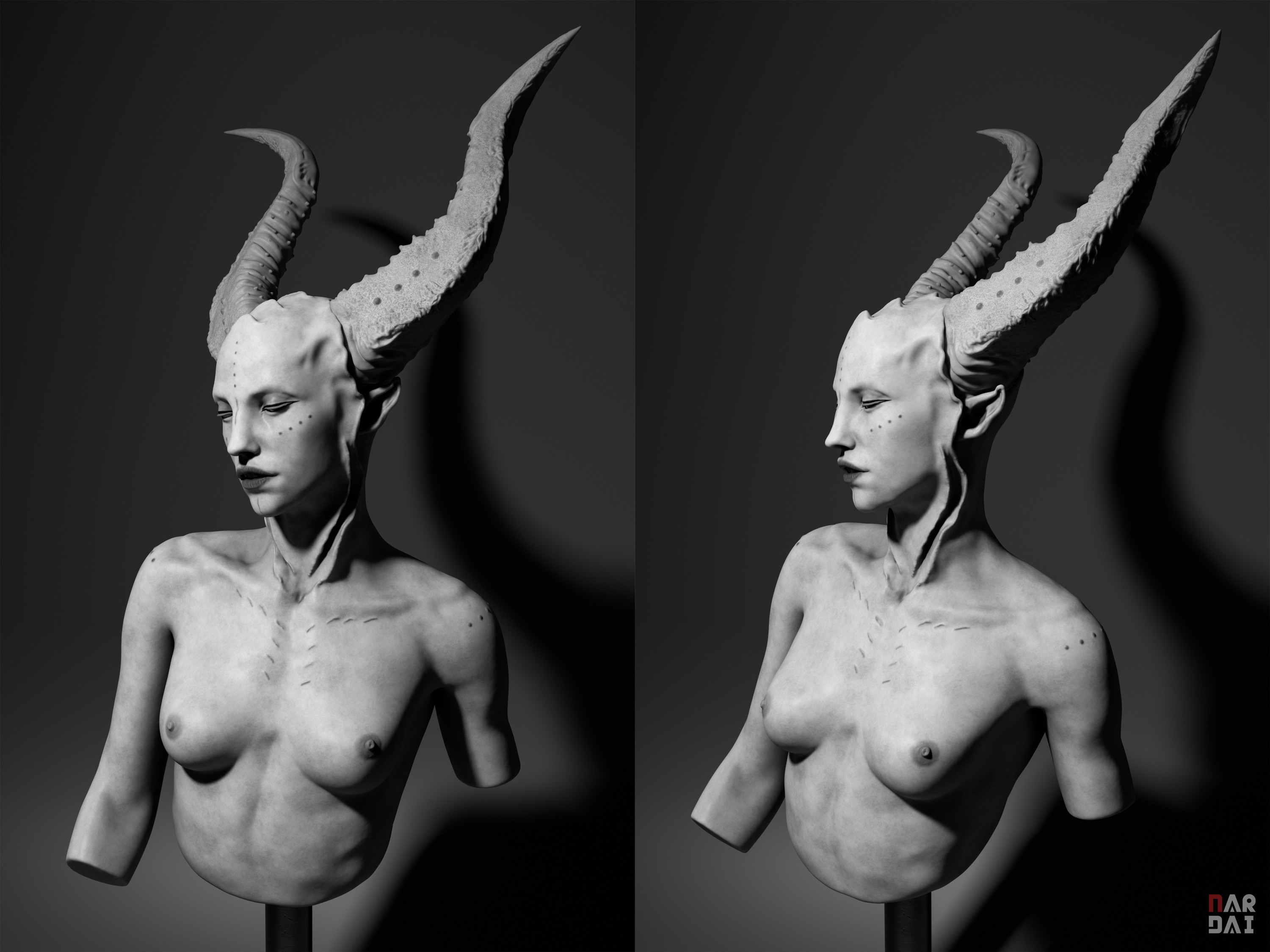 A female bust of a faun. The design and the renders were hugely influenced by the brilliant Niyazi Selimoglu, the powerful André Castro, and Luke Starkie. I quite enjoyed the simple presentation aspect of it. Might do some other fantasy stuff in this style.