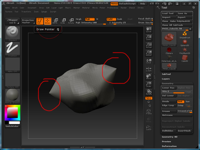Ive been bugged by these points you get on zbrushs primitives. The model I made yesterday always had a problem with its nose because of it, so today I thought Id start with a square but Ive found the same problem staright away. Does anyone know how to get rid of these irritating points? I thought there were two types of sphere primitive, one that was a genuine sphere, and one that was kind of a squarey/sphere:p type thing. So annoying. Hopefully this pic illustrates the problem. I try modelling over these regions, but any smooting just capitulates the whole area.