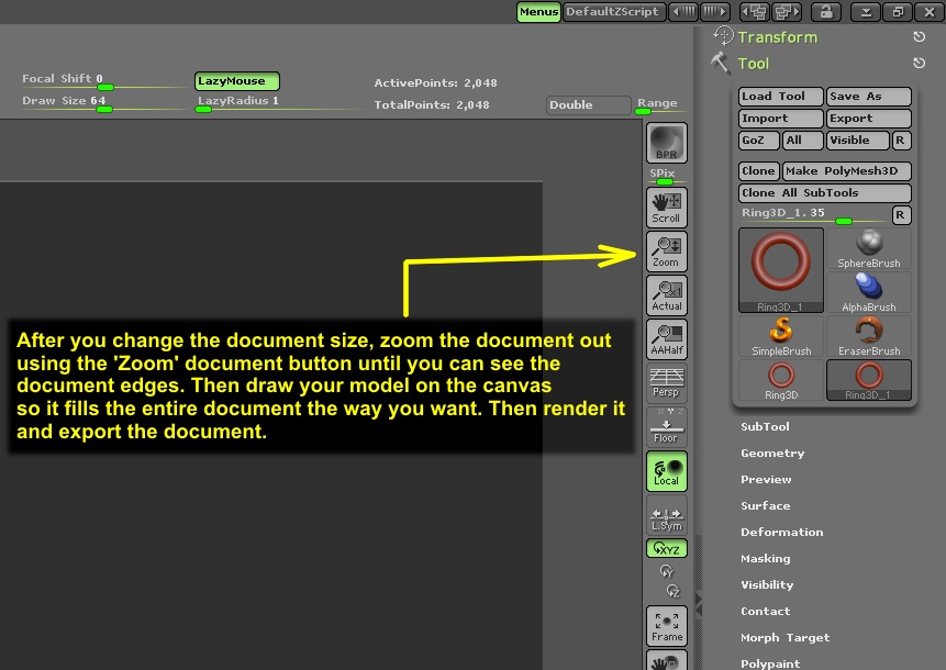 When I start wtih zbrush, I leave the doc size at it’s default. i like it. But when i render, I want a high res output file. So… I need to change the doc size.