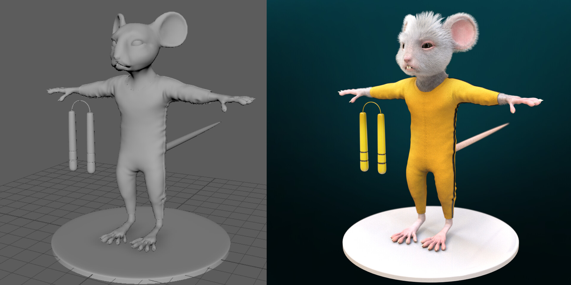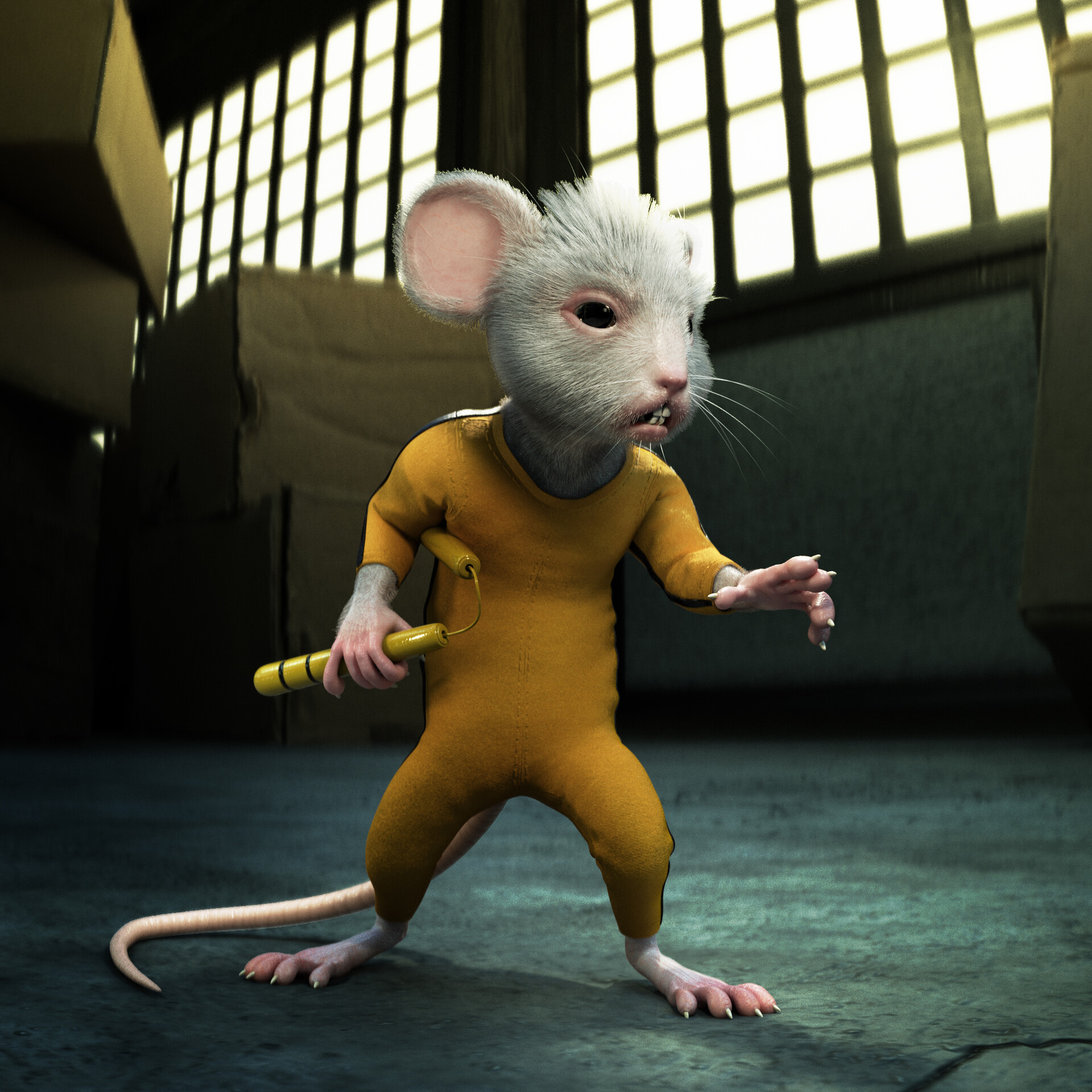This little mouse was Bruce Lee inspired by his movie “Game of Death”. It was a concept I did a few months ago. It was modeled in Zbrush, Textured in Substance Painter, and rendered with Redshift.
