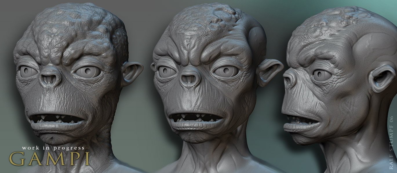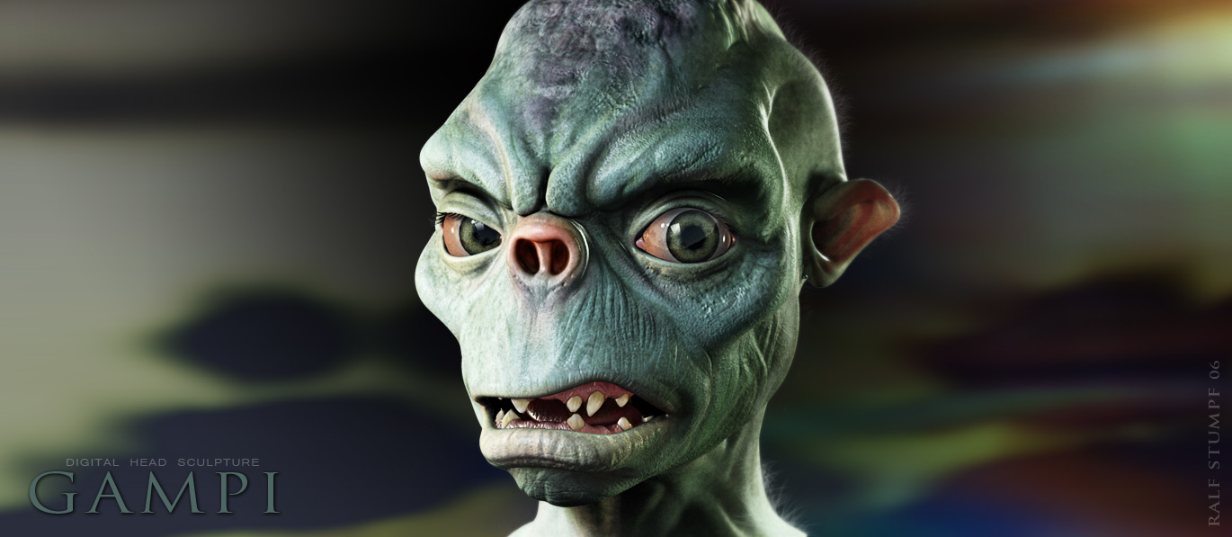 That forest Gampi seems to have interbred with Gollum…he looks a bit like the early Weta-models,… before they made him look more humanoid !..and your early Gampi looked more humanoid, but seems to have transformed to a more animal/froglike being in his forest-incarnation…are you planning to model your character on animal or more on humanoid characteristics ?