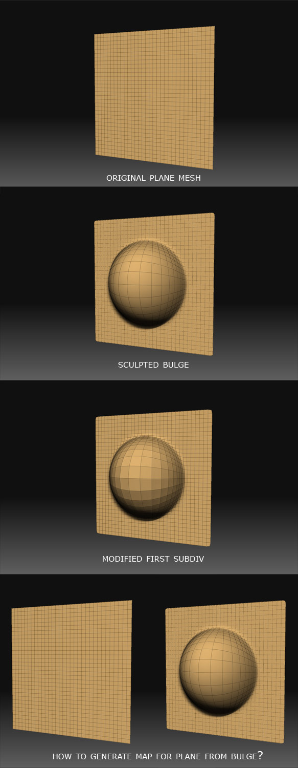 I’m going to explain you everything. I have a base mesh, PolyPlane in my example. I sculpt some bulge on it. And finally I want to generate normal or displace map for the original plane. There the problem comes. First subdivision is now modified too, for sure. Is there any solution to generate it for original Plane?? I tried to store original as morph target but it modifies last subdivision too, for sure :(. Take a look at pictures.