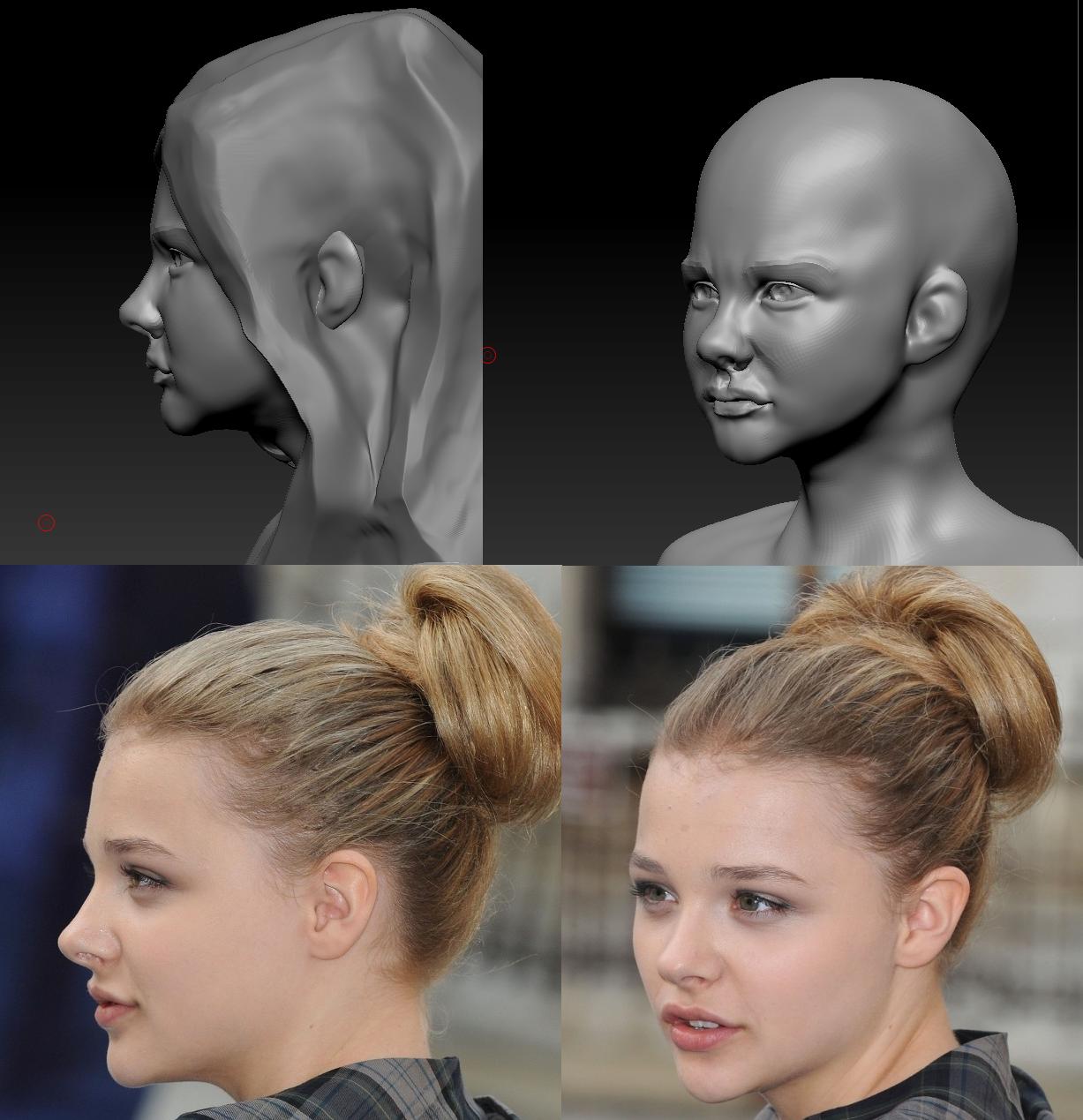 yes, that is exactely as it will work,first the forms later the detail… your sculpt is getting much better. nice. check out if the chin is correct from sideview. it looks as if it is a bit too far back, usually it sits about half way under the nose, but check with your reference fotos, she might have the chin back like that. also, check the cheeks from the sideview. from the front view fotos you posted, i would think they are more rounded. … keep going, you are on your way