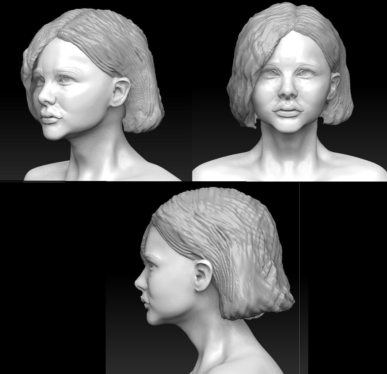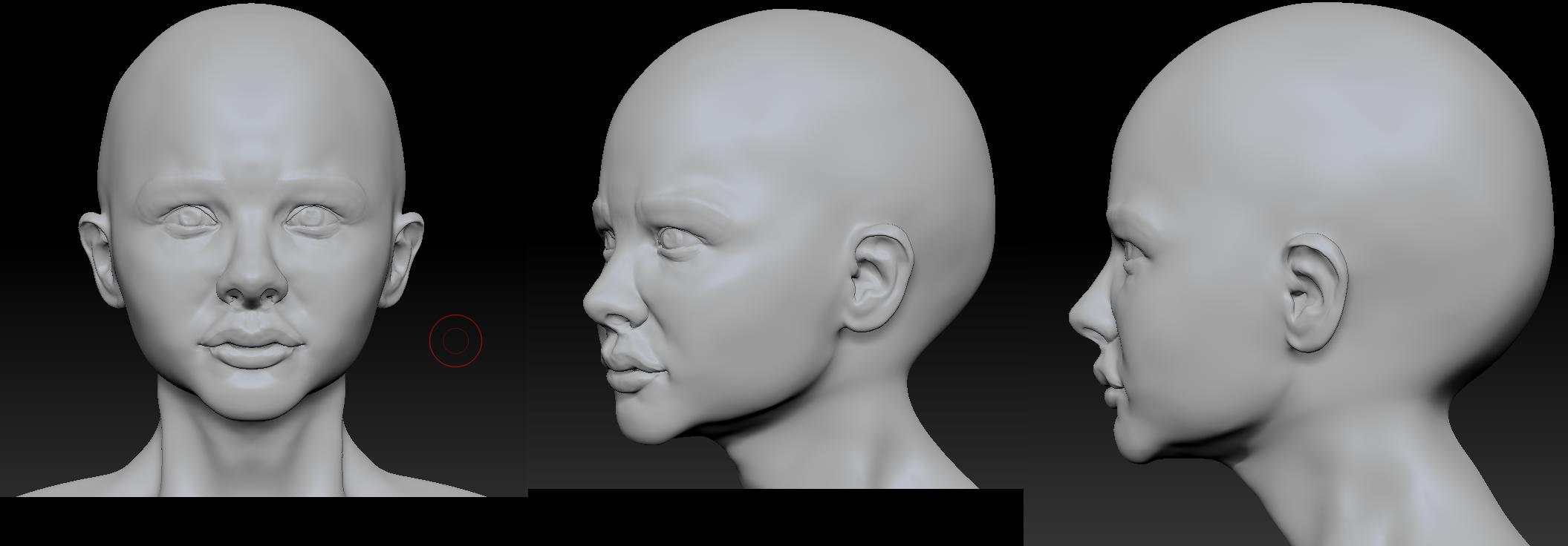 it is a pleasure to help when seeing how much you improve… she is great already… two things might push her a little more : first, look how far back her mouth corners are,in side view, they are not so far back in your sculpt… and, look at her eyes, at the lower lid. can you see how it fits nicely around her eyeball ? even though it covers the eyeball, we have the feeling we can see the roundness of the eyeball under the flesh of the eylid… try to capture this in your sculpt, by pushing the groove you made to indicate the lower lid, farther back, turn on transparency and now try to move this part of the mesh that it sits snuggly around the sphere you inserted as eyeball to shape a lowerlid like she has … i believe when you put these two things, you get very good likeness. you can always tweak to get closer, but now you did already great…