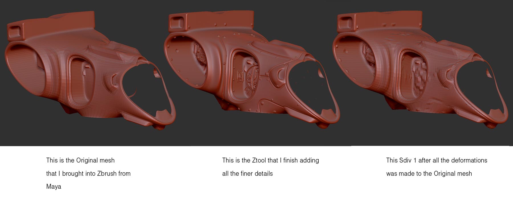 Hello poeples, I need your help with something, I think it might be a noob question but I’ve been messing with Zbrush for over 2 years. My question is, how do you make a normal map for your original mesh that you brought into Zbrush from Maya first and have it look like good? I’ve always for organic forms just brought my mesh in from Maya and started applying my deformations and then dropped my divisions down to 1 and exported that new model obj out. Just this time because it’s a mechanical piece that I’m working on I want to apply it to the original mesh. I hope this makes scene cause I’m having a tough time trying to explain it.