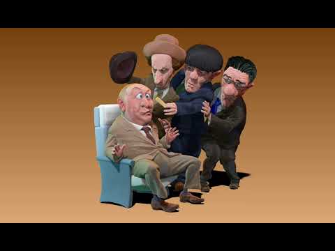 Curly , Larry , Moe and Shemp , did appear all together briefly only one time on screen, in a Three Stooges Columbia Pictures short, ‘Hold that Lion’ , which this vignette is modeled after. Curly, recovering from a stroke in real life, had a cameo as a sleeping (snoring) passenger on a train, hence the clothespin.