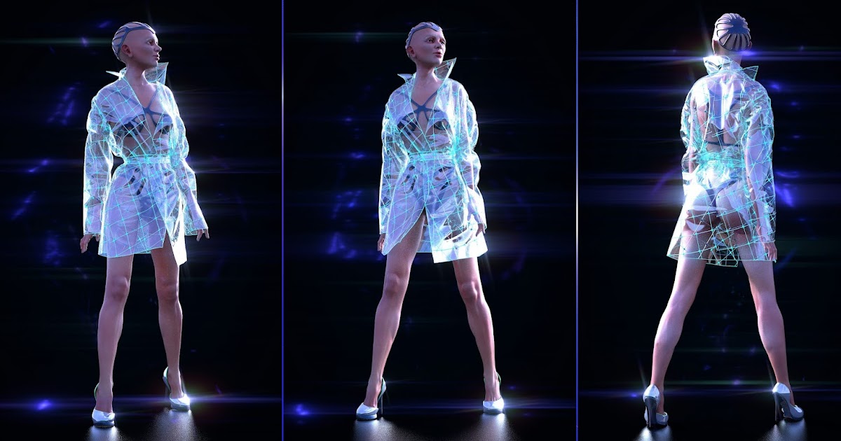 Idoru / Space travel - something a little more space style ) Luminescent transparent vinyl trench coat. Testing Transparent effect material rendering with Iray. Something at the intersection of the senses of the William Gibson and Blade Runner worlds.