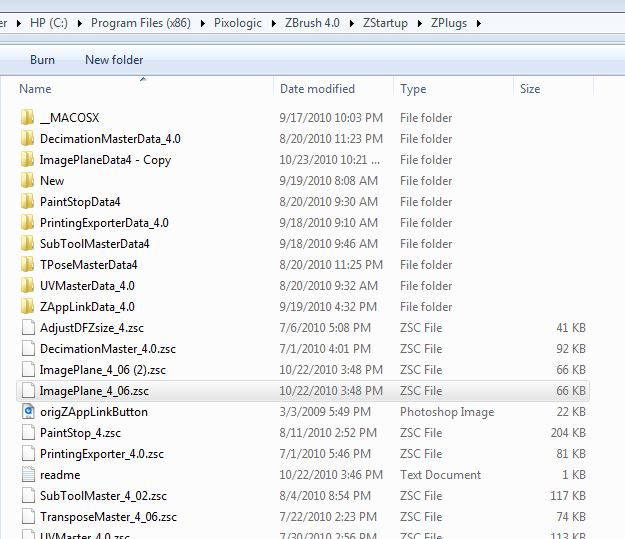 In zbrush if I open my doc window I only see either the data folder or the zsc. folder because if I try to put in the second folder I get the menu “do you want to copy or replace this file”.I’ve looked in the regular texture menu as well as the spotlight texture and dont see any menus for image planes.Ive never had trouble before with the other plugins.Hopefully I did’nt make this more complicated than it is.Enclosed is a pic of these 2 folders.