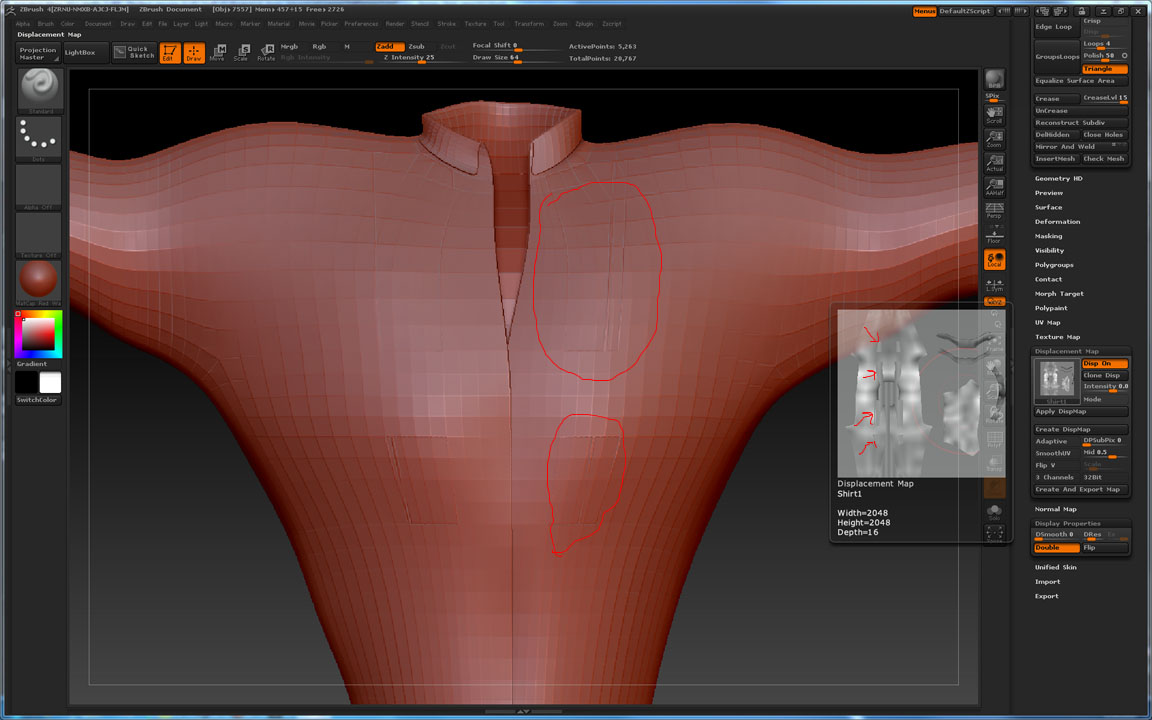 I wanted to sculpt details for a shirt. The basemesh comes from Maya and everything looks correct. But when i create the Displacement Map inside Zbrush, i get a strange effect: